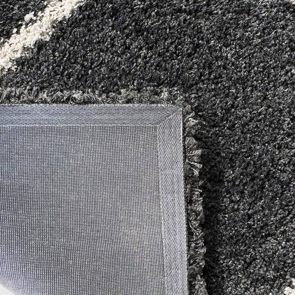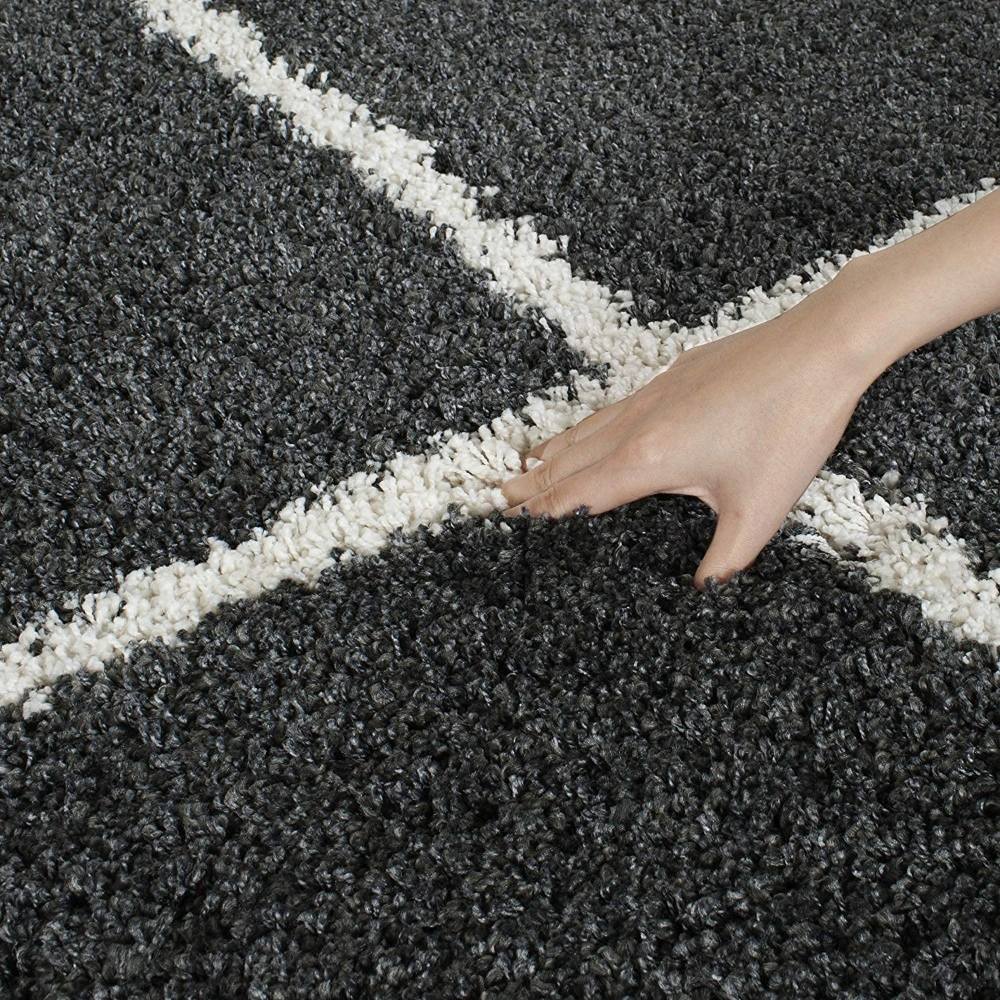 Vacuum gently to keep the shag pile soft and dust-free. Spot clean with mild detergent for spills. Avoid prolonged sunlight exposure to maintain the dark grey and ivory contrast.