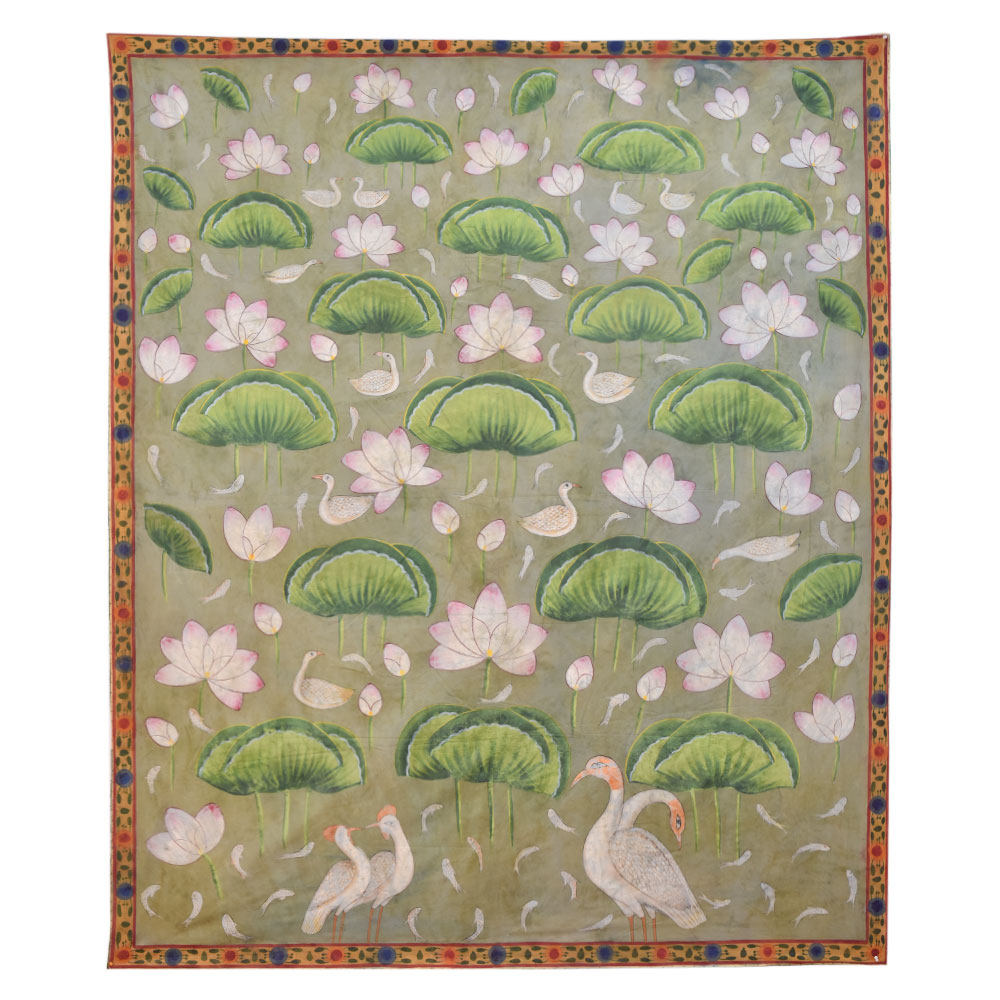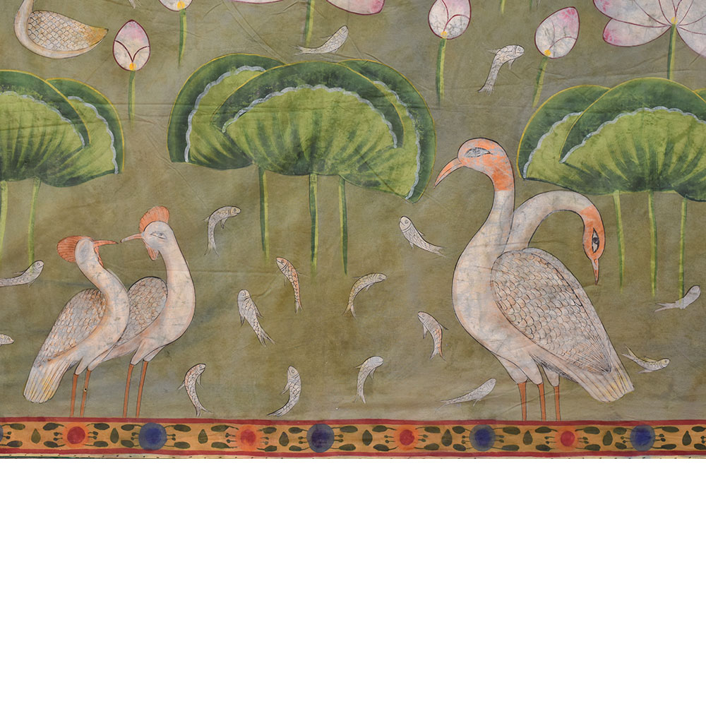 A stunning pichwai painting on fabric cloth which showcases a picturesque scene of a tranquil pond brimming with vibrant lotus flowers, lush pond leaves, and an array of playful fishes, swans, and ducks. Expertly crafted by skilled Indian artists, the painting is adorned with intricate details and a captivating palette of multi-colours, which bring the scene to life and create a sense of serene beauty and harmony. Adding to its charm, the painting is framed with an exquisite floral border, which further highlights the splendour of the main composition. Whether you choose to hang it in your prayer room or living room, this pichwai painting is sure to mesmerize and captivate all who behold it, serving as a constant reminder of the innate beauty of nature and the importance of finding inner peace and tranquillity. Moreover, this remarkable artwork makes for an exceptional gift for your loved ones on special or festive occasions, allowing them to bring the same sense of beauty and serenity into their homes and hearts.