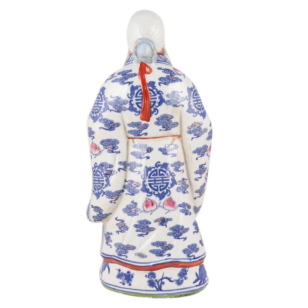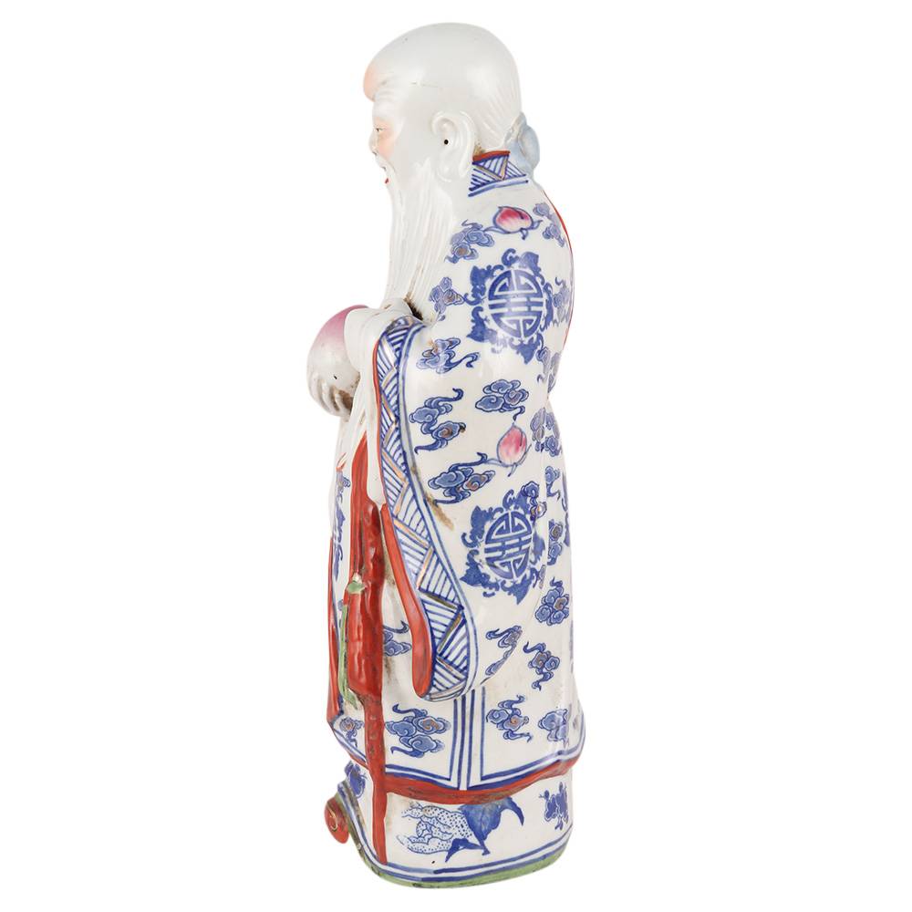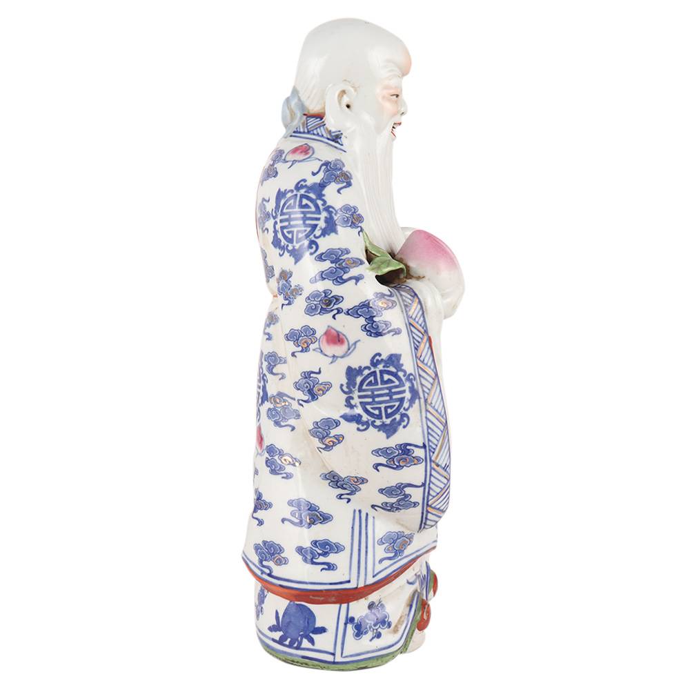 Sau, the Chinese god of longevity, is a symbol of ease, smooth existence, and triumph over conflict. A gourd is thought to store the elixir of life, or immortality, and is attached to the end of his staff. Sau is typically shown clutching a peach, the divine fruit of the gods. This statue is made in porcelain