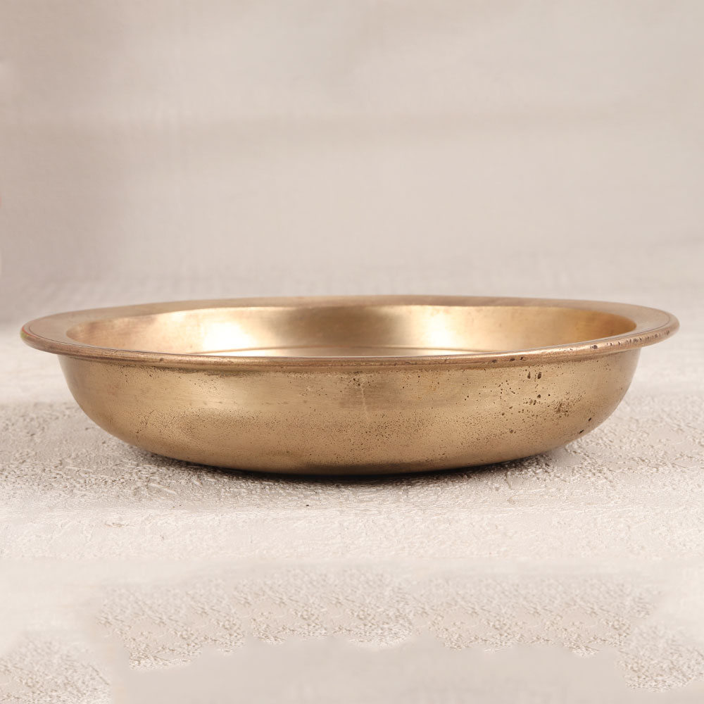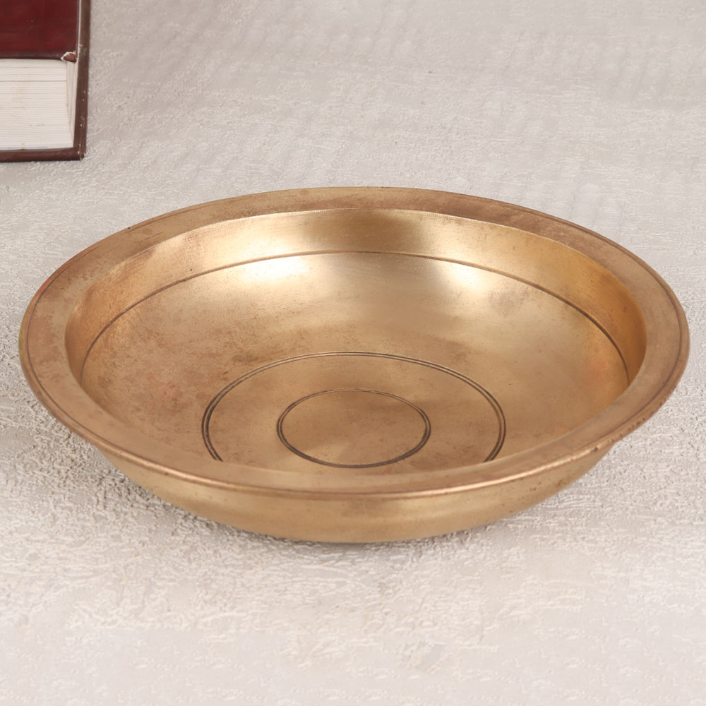 Buy a Vintage Bell Metal Bowl online that is a masterpiece meticulously crafted by skilled artisans from Northern India. This piece serves a dual purpose as a unique god bathtub, exuding an aura of cultural richness and spiritual significance. Handmade from premium bell Metal, the bowl boasts a stunning shiny golden finish that adds a touch of opulence to any setting. The artistry of Northern Indian craftsmen shines through in every detail, showcasing their dedication to preserving traditional techniques. Beyond its sacred function, this versatile bowl serves as a captivating decorative element suitable for a variety of environments, including homes, offices, restaurants, hotels, and cafes. Its radiant golden hue and vintage charm make it a standout addition to any interior, contributing to a sense of sophistication and cultural appreciation. This Vintage Bell Metal Bowl is more than just a piece of decor, it's a collector's item that can be cherished for generations. Gift it to your family, friends or relatives on special, festive, or auspicious occasions, and let its cultural and aesthetic significance resonate in their hearts.