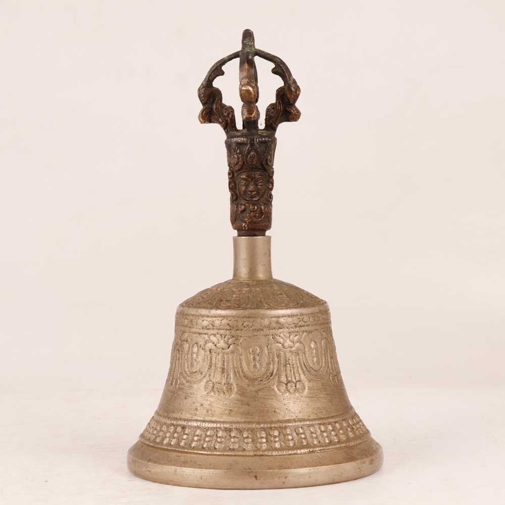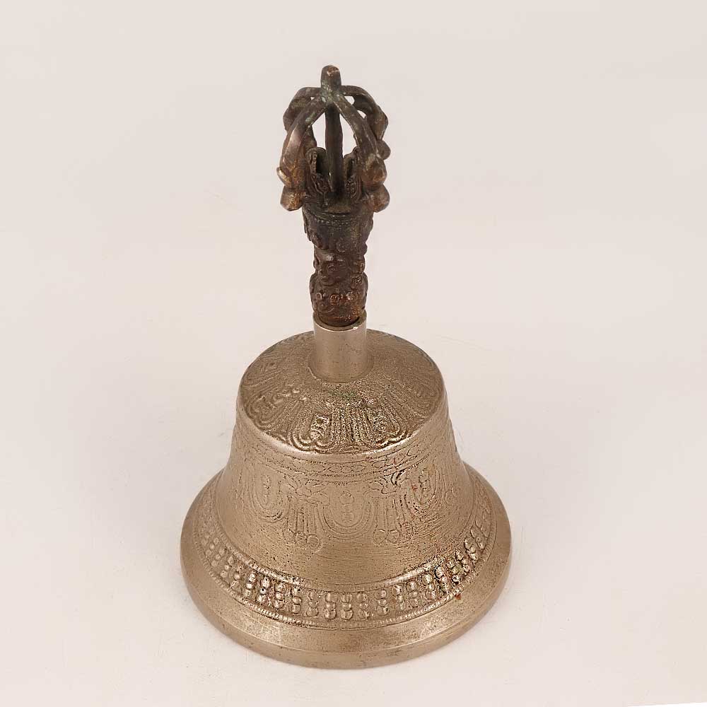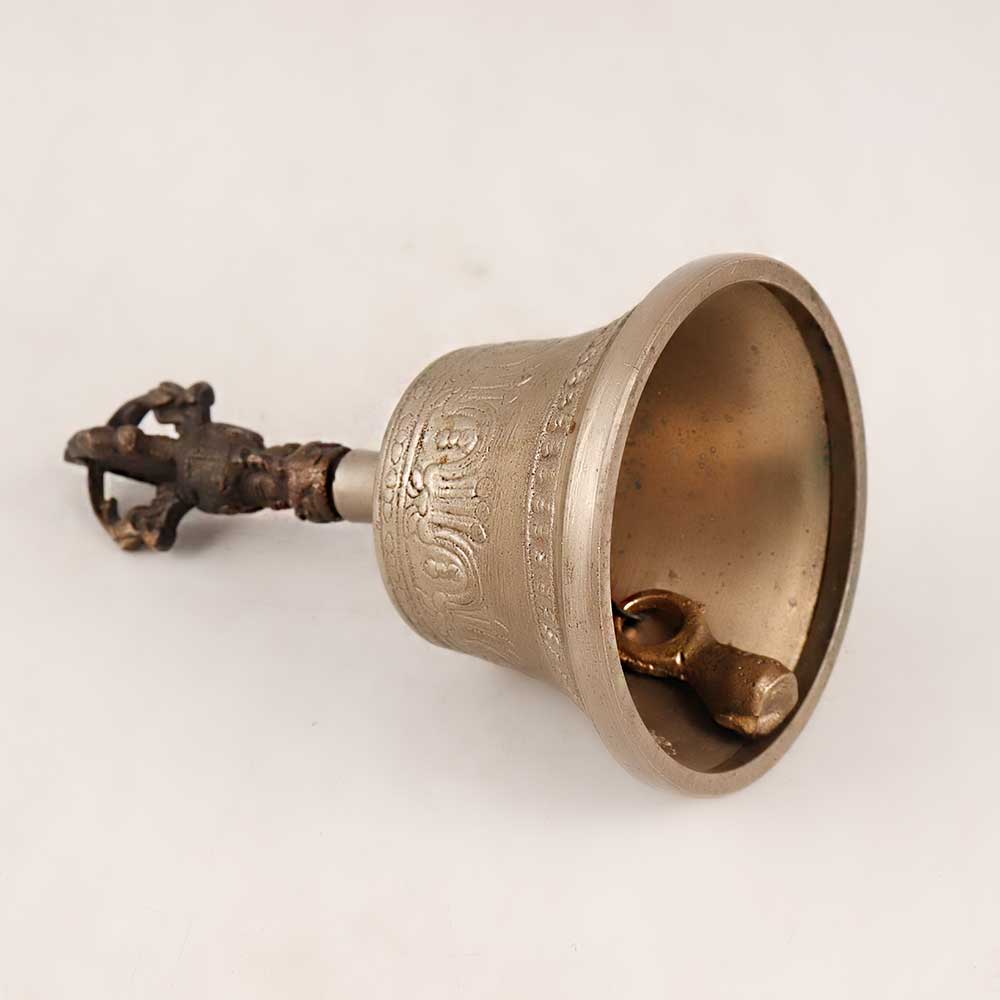 Immerse yourself in the sacred ambiance of Buddhist art with this exquisite Tibetan bell, a masterpiece of craftsmanship and devotion. Crafted from high-quality bell metal, its antique brown finish exudes timeless elegance. The bell is adorned with intricate engravings that showcase the mastery of skilled artisans, depicting the essence of Buddhist philosophy and spirituality. At the handle of the bell, a delicately engraved deity figure stands as a symbol of enlightenment and protection, infusing your space with a sense of tranquillity and reverence. Handmade with meticulous attention to detail, this bell carries not only the resonance of its sound but also the essence of devotion. Perfect for various settings, such as your home, office, restaurant, hotel, or cafe's prayer room, this bell serves as a focal point for morning and evening prayers, fostering a serene atmosphere. Its allure extends beyond personal spaces – consider displaying it at exhibitions, adding a touch of spiritual allure to your vintage collection. Moreover, this bell makes for a thoughtful and meaningful gift. Present it to your loved ones on special, festive, or auspicious occasions, sharing the blessings of Buddhist art, culture, and mindfulness.