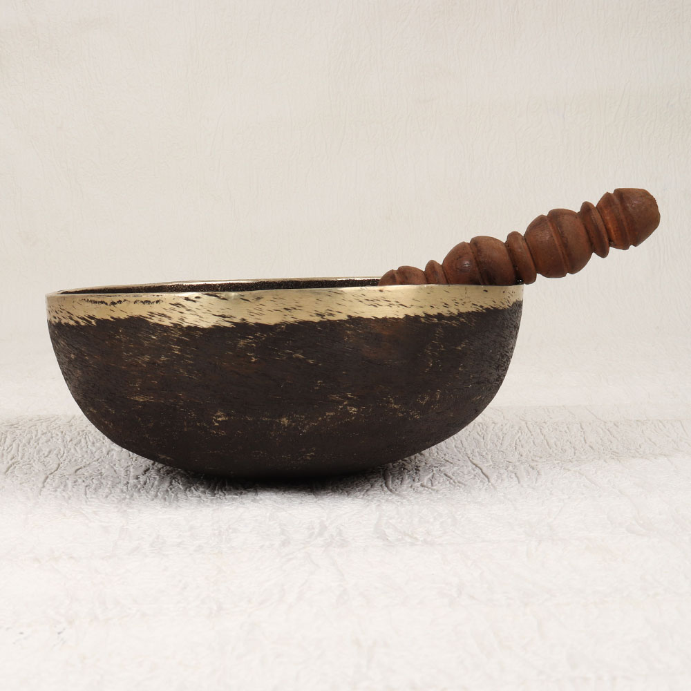 A Vintage Bell Metal Om Singing Bowl that is a harmonious blend of artistry and spirituality. Handcrafted by highly talented Indian artisans in the timeless Tibetan tradition, this masterpiece emanates an aura of authenticity. Fashioned from high-quality bell metal, the bowl features an antique finish, adding a touch of vintage charm to any space. The set includes a carefully crafted wooden mallet, enhancing the resonance of the bowl when played. Its versatility makes it a perfect addition to various settings, such as home, office, restaurant, hotel, or cafe, where it can serve as both a decorative piece and a source of tranquillity. Designed for meditation, the resonant tones produced by the singing bowl create a serene atmosphere, facilitating mindfulness and relaxation. Incorporating this meditation bowl into your daily practice can enhance focus and promote inner peace. Moreover, its antique allure makes it a captivating addition to any vintage collection. Consider this Vintage Bell Metal Om Singing Bowl as a thoughtful gift for your loved ones on special, festive, or auspicious occasions.