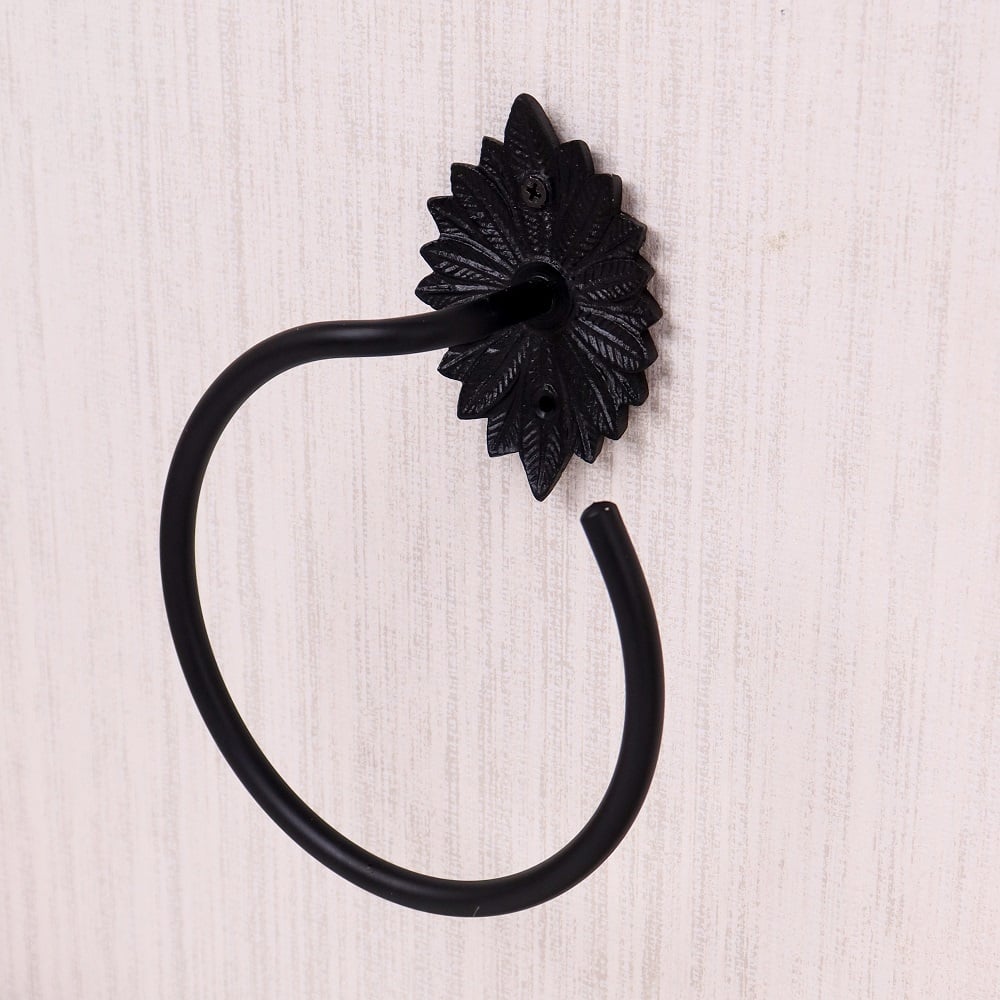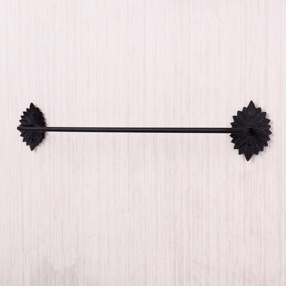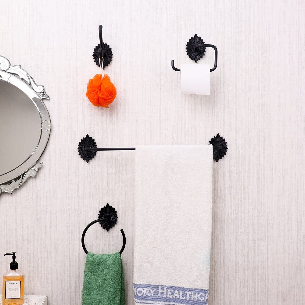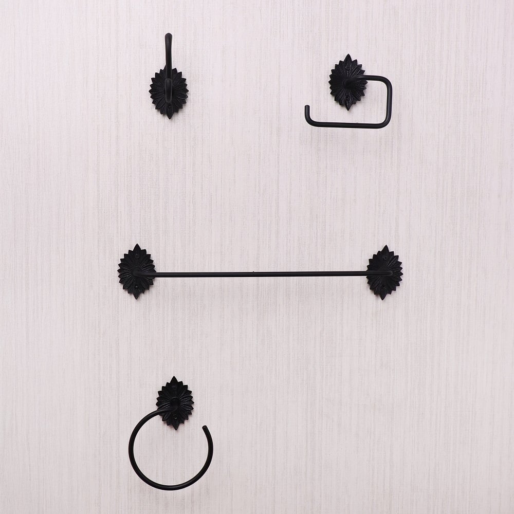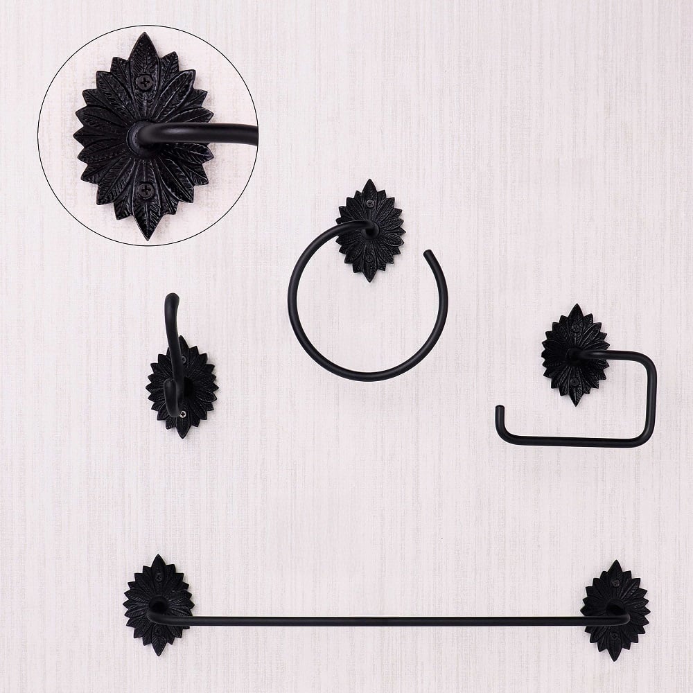 Enhance your bathroom décor with this elegant black aluminum accessory set of 4, crafted for both durability and style. Featuring a beautifully detailed floral backplate, this vintage-inspired set includes a towel bar, hand towel ring, toilet paper holder, and a versatile wall hook. Made from high-quality aluminum with a matte black finish, each piece is lightweight, rust-resistant, and designed to withstand daily use. Perfect for adding a touch of sophistication to both traditional and modern bathrooms, this coordinated set keeps your space neat, functional, and aesthetically pleasing.