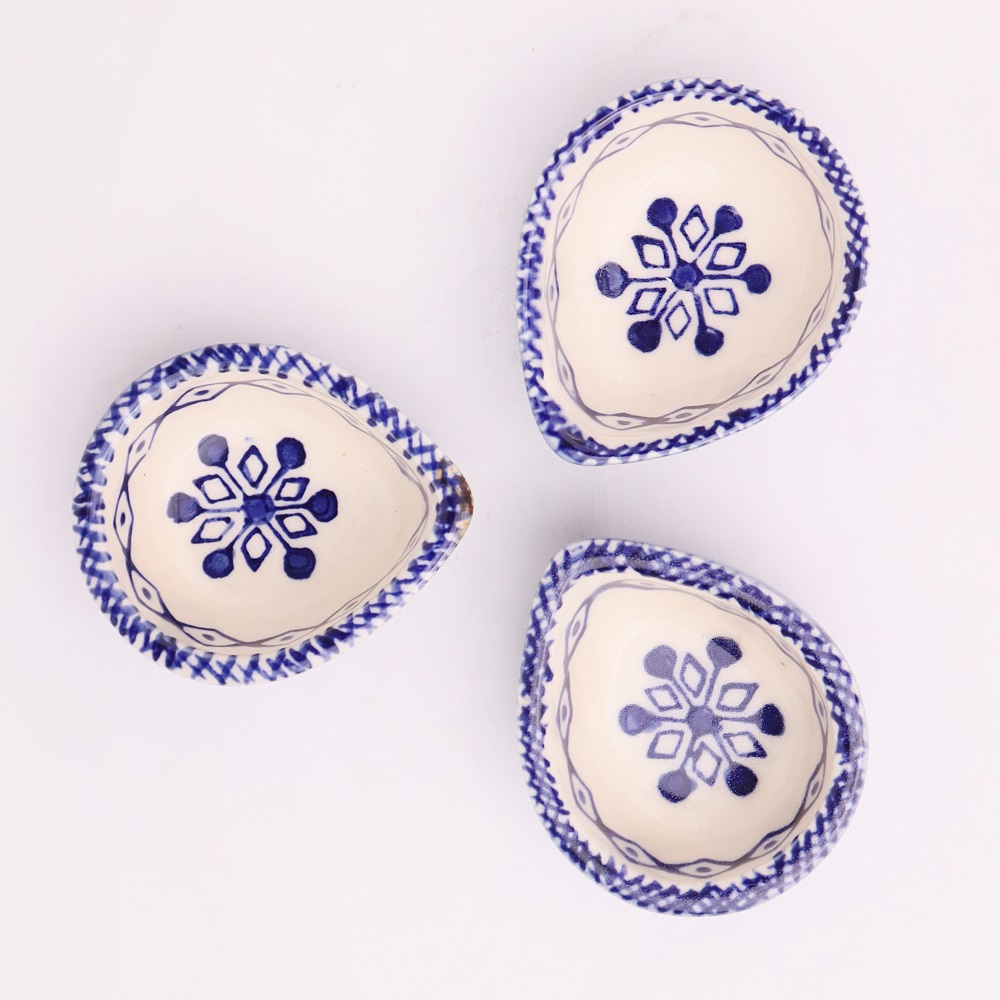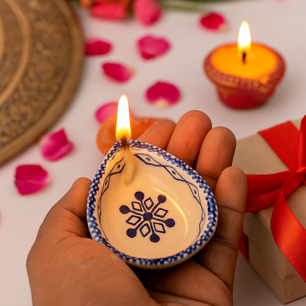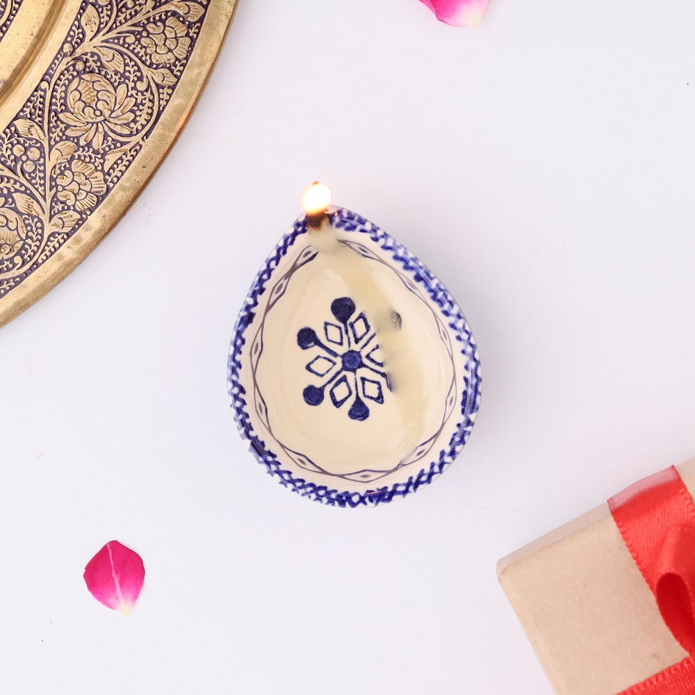 Elevate your festive rituals with this premium blue and white ceramic Diwali diya, a handcrafted masterpiece designed for temple decoration and sacred spaces. Featuring delicate hand-painted floral motifs in indigo blue against a white ceramic base, this diya reflects both tradition and timeless artistry. Compact yet striking, it offers a warm spiritual glow while serving as a decorative accent for modern and traditional homes alike. Designed by artisans who specialize in ceramic craft, this diya brings devotion and elegance into harmony.