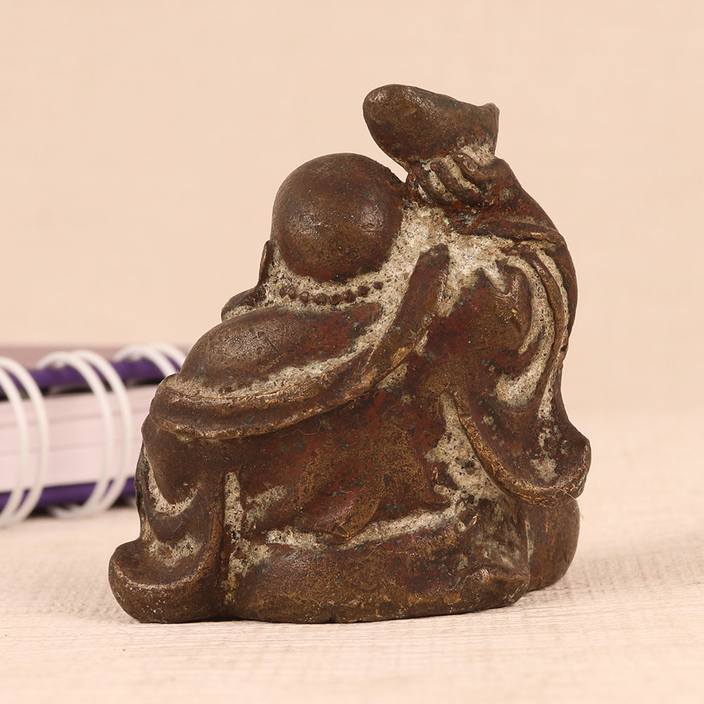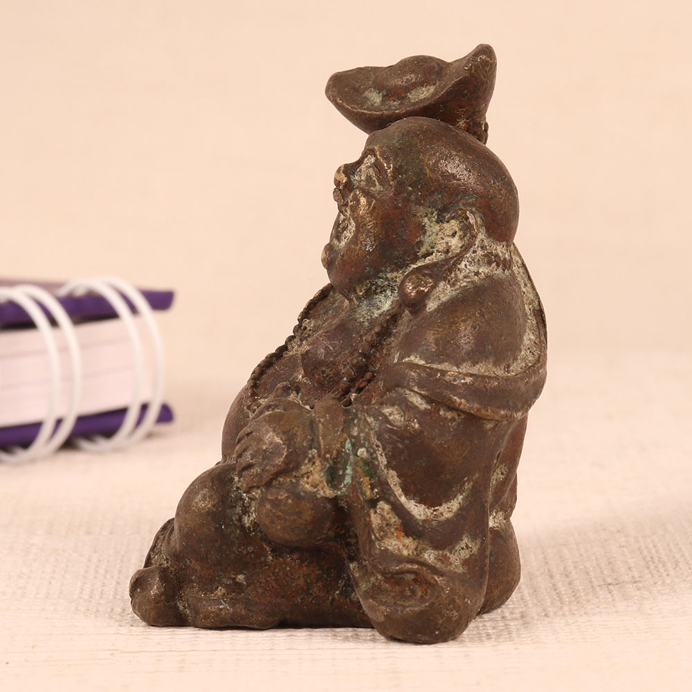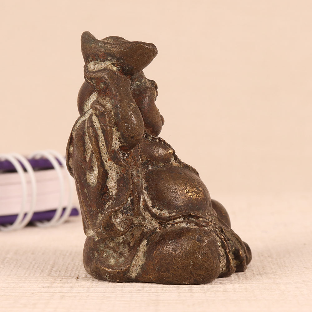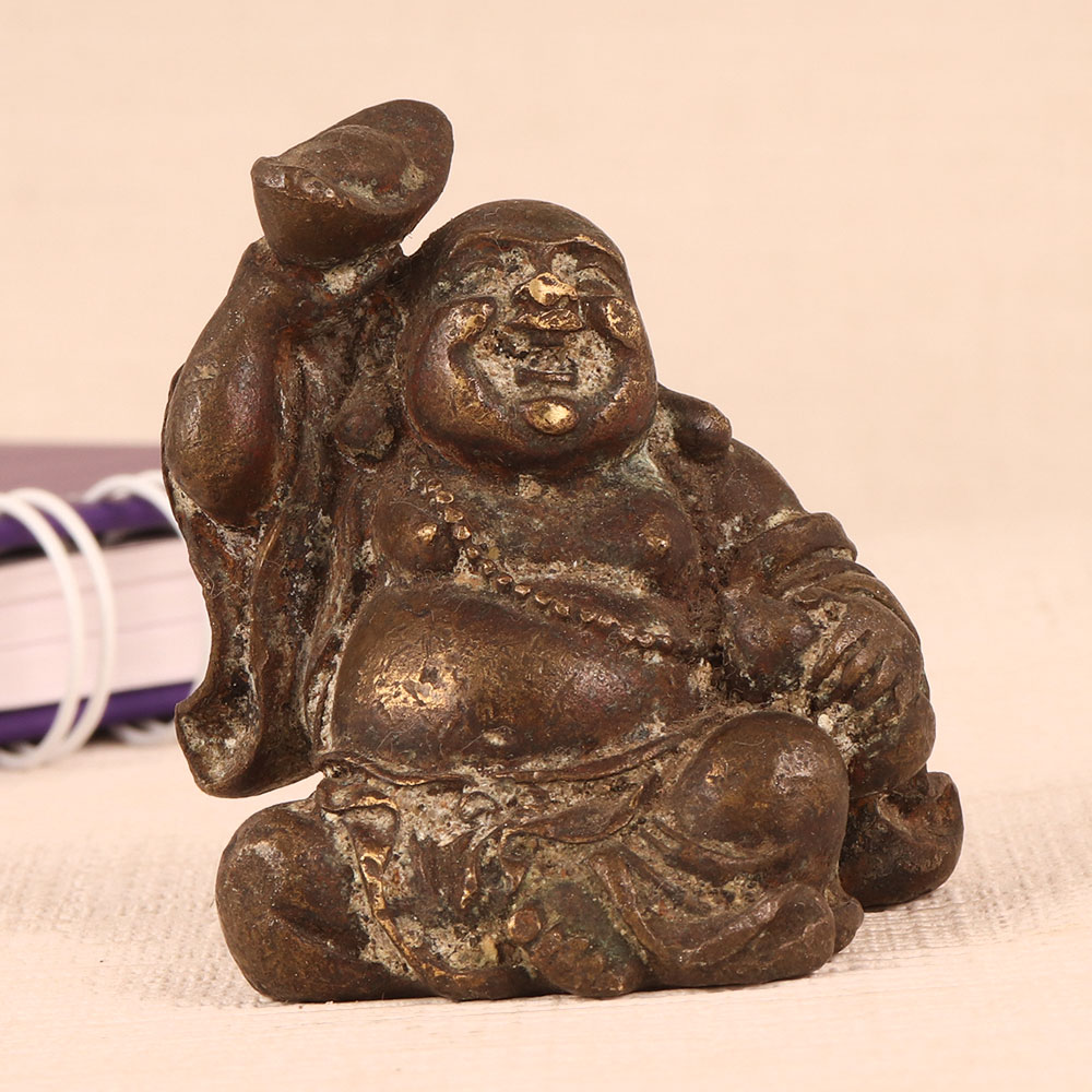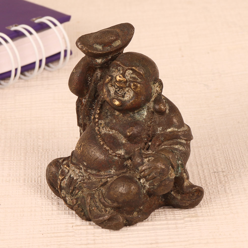 This Vintage Brass Laughing Buddha Statue is a timeless masterpiece meticulously handcrafted by highly skilled Indian artisans. This remarkable piece showcases the jovial Laughing Buddha in a seated position, radiating positivity and joy, symbolizing good luck, prosperity, and contentment. Crafted with meticulous attention to detail, this statue features an antique brown finish that exudes an air of nostalgia and authenticity. Its vintage charm and artisanal craftsmanship make it a remarkable addition to any setting, whether it be your home, office, restaurant, hotel, cafe, or shop. For collectors with an eye for vintage treasures, this Laughing Buddha statue is a must-have, adding depth and character to your antique collection. Its historical significance and exquisite design make it a true conversation piece. Looking for the perfect gift? This Laughing Buddha statue is a thoughtful choice for your loved ones on special, festive, or auspicious occasions. Whether it's a housewarming, wedding, or any other celebration, this statue brings blessings and positivity to any space it graces.