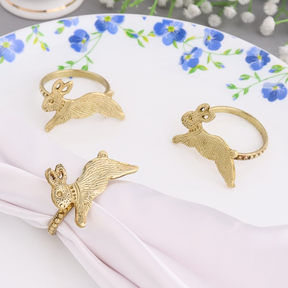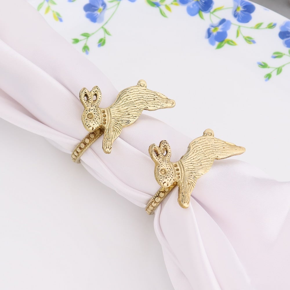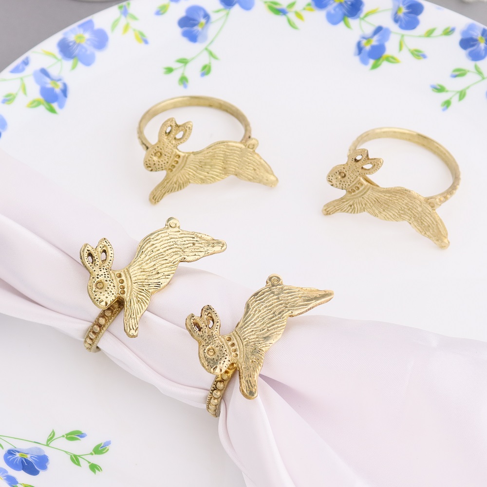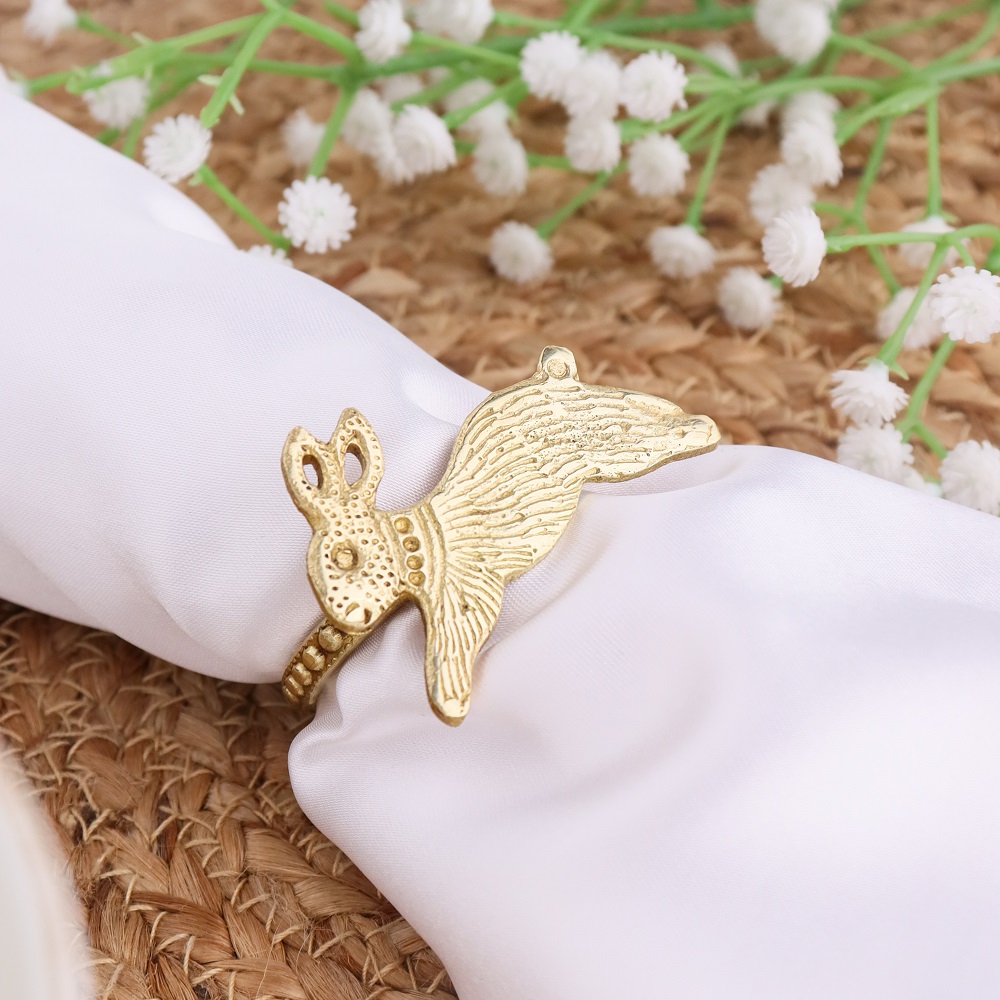 Enhance your dining experience with these exquisite Brass Napkin Rings featuring a captivating rabbit design, presented in a set of four. Each ring showcases an antique golden finish, adding a touch of sophistication to any table setting. Meticulously handmade by highly skilled and experienced Indian artisans, these napkin rings boast a seamless blend of traditional craftsmanship and contemporary elegance. Crafted from high-quality brass, these napkin rings not only ensure durability but also exude a timeless charm that complements various dining styles. Their smooth and polished surface makes sliding napkins in and out effortless, keeping your table neat and tidy during meals. Beyond their functional utility, these charming napkin rings also double as remarkable gifts for your loved ones. Whether it's a special occasion or a festive celebration, presenting this set as a thoughtful gift will surely delight your friends and family, expressing your affection and appreciation.