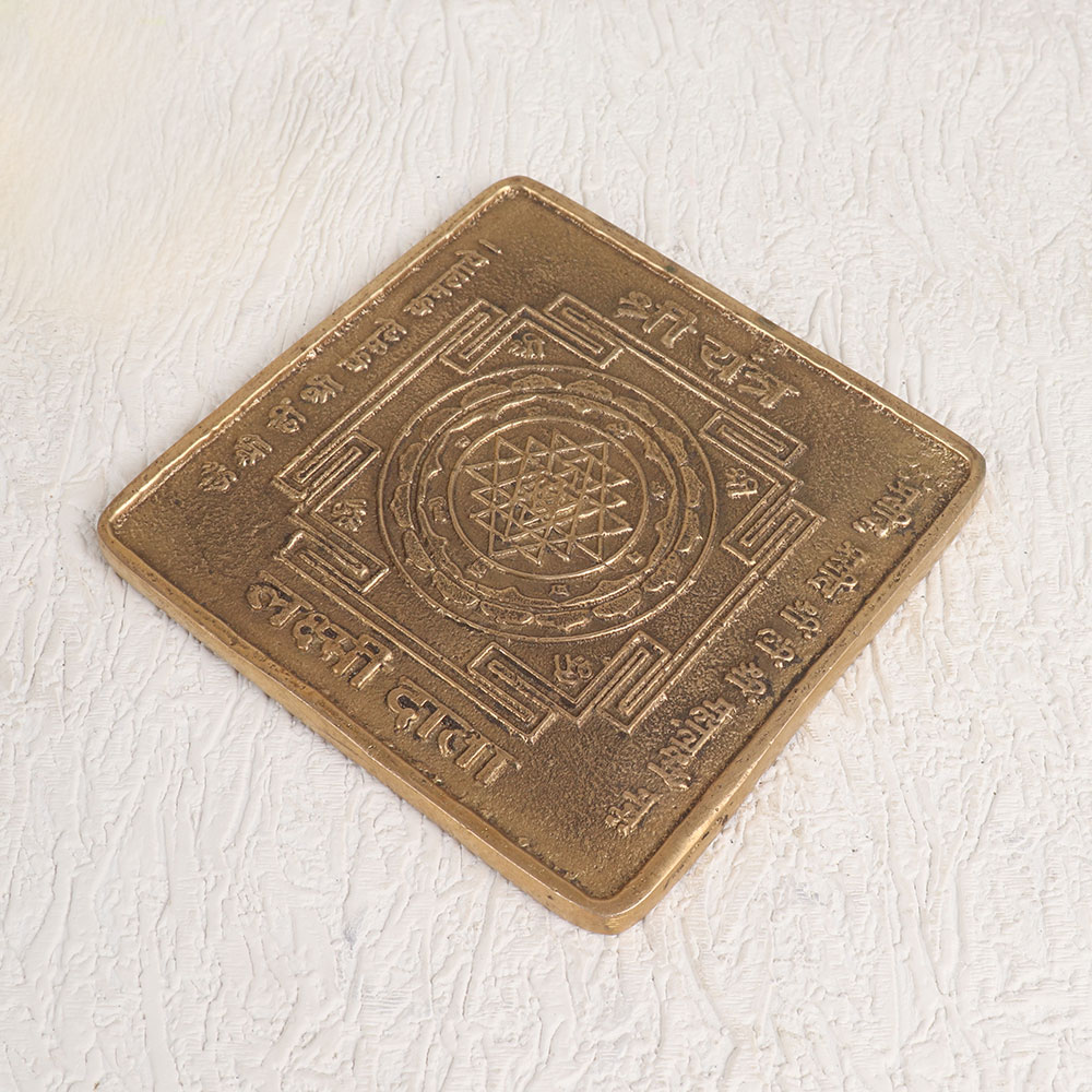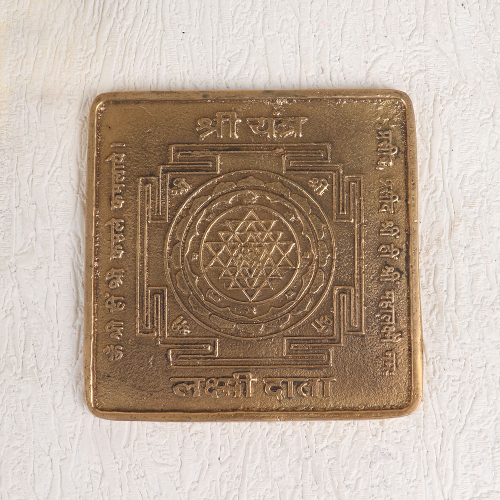 Enhance your spiritual space with our exquisite Square Brass Shri Yantra dedicated to the goddess Lakshmi. Crafted by skilled Indian artisans, this ornate piece boasts an antique brown finish, lending a sense of timeless elegance and heritage to any setting. Goddess Lakshmi is revered as the embodiment of wealth, prosperity, and abundance. Placing this sacred yantra in your home, office, restaurant, hotel, cafe, or shop's prayer room invites her blessings and brings positive energy into your surroundings. Its square shape symbolizes stability and balance, making it a perfect addition to your decor. Meticulously handcrafted from high-quality brass, this Shri Yantra not only holds spiritual significance but is also a piece of art that can be proudly displayed in your vintage collection. It serves as a thoughtful gift for your loved ones on special, festive, or auspicious occasions, imparting both beauty and spiritual meaning to their lives.