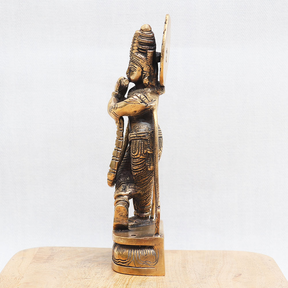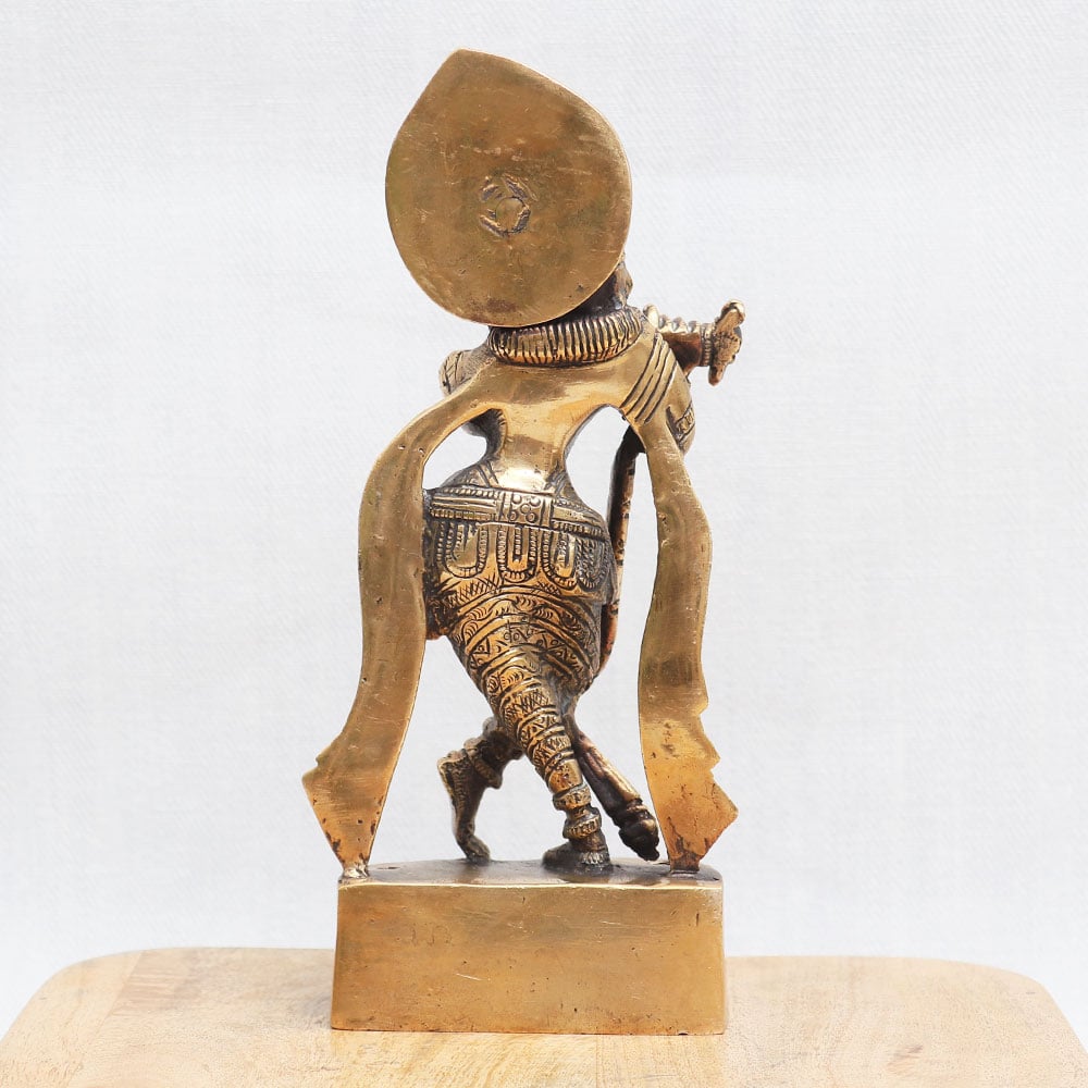 Buy a Lord Krishna Murti online and get a hassle free delivery at your doorstep. Standing elegantly with his legs crossed and playing the enchanting flute, Lord Krishna emanates a sense of tranquillity and devotion. Crafted with attention to detail, this murti showcases the craftsmanship of highly skilled Indian artisans who have brought to life the timeless beauty of Lord Krishna. The antique brown finish adds a touch of antiquity, making it a captivating addition to any interior decor. Ideal for temple worship, this bronze statue can also be used to adorn your home, office, cafe, restaurant, gym, or hotel temple, infusing the surroundings with an aura of spirituality. As you explore murti online, this Indian god statue holds a prominent place among the collection of god idols for home. It serves as an auspicious gift, perfect for presenting to your loved ones on special, festive, or auspicious occasions.
