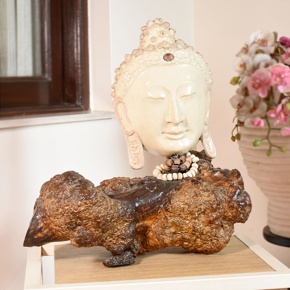 Ceramic Artist Meena Vohra brings her signature artistry to this Buddha sculpture. The form embodies serenity with gentle contours and closed eyes offering a calming accent for meditation spaces and tranquil interiors. Each piece is handmade packed and quality checked by Indianshelf.