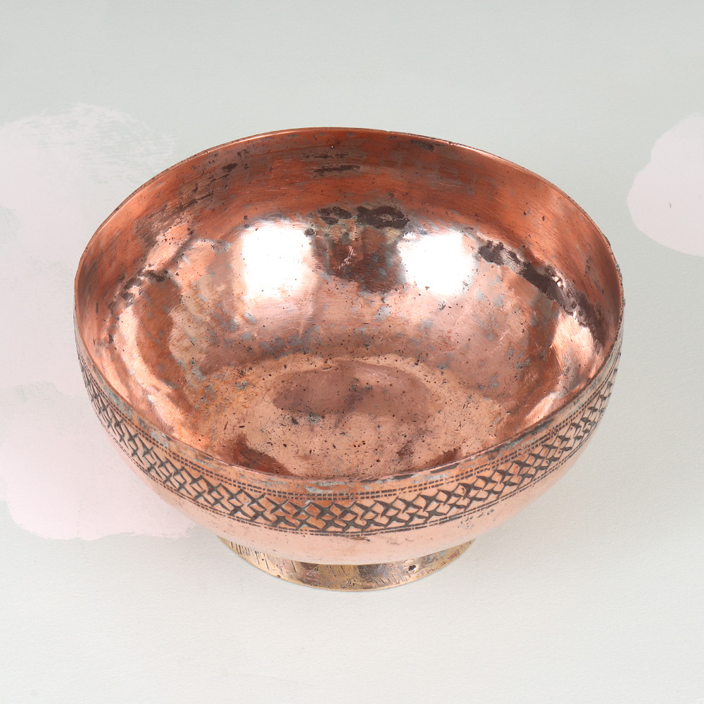 Unlock the timeless beauty of Peshawari art with this exquisite vintage copper Islamic bowl. Meticulously crafted by skilled artisans, this stunning piece is a testament to the rich cultural heritage of the region, blending intricate designs with the warm glow of copper. Elevate your home decor with the captivating allure of this vintage copper Islamic bowl. More than just a decorative piece, this bowl embodies the timeless artistry of Peshawari craftsmanship, transporting you to the vibrant streets of Pakistan. Display it proudly on a mantel, shelf, or table, and let its mesmerizing patterns and warm metallic tones infuse your space with a sense of cultural richness and timeless beauty. Whether you're a collector of fine art, a lover of global design, or simply seeking to add a touch of elegance to your home, this vintage copper Islamic bowl is the perfect addition. Imagine the admiring glances and conversations it will spark, as guests marvel at the intricate details and the captivating history behind this remarkable piece. Elevate your living space and immerse yourself in the captivating world of Peshawari art with this stunning copper bowl.