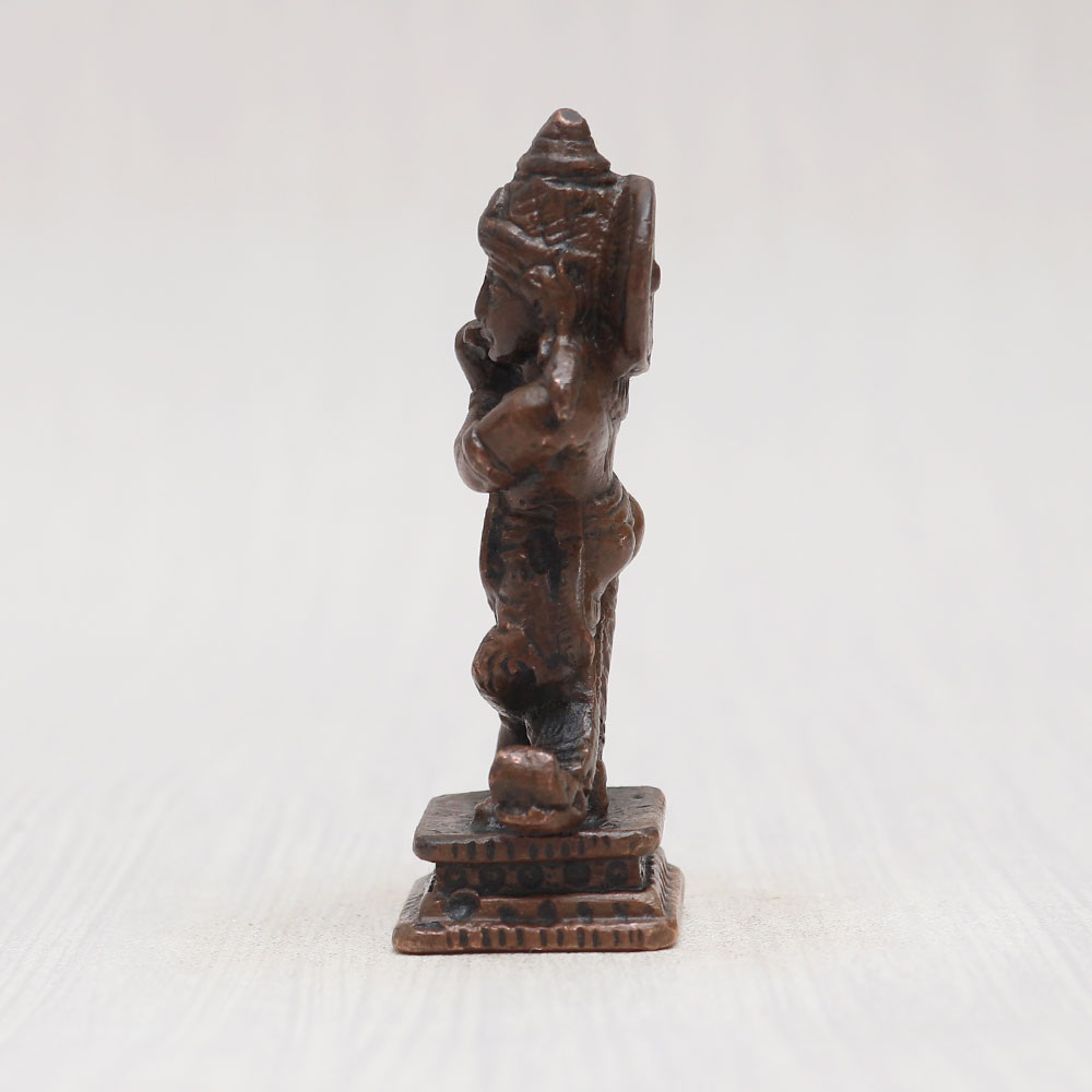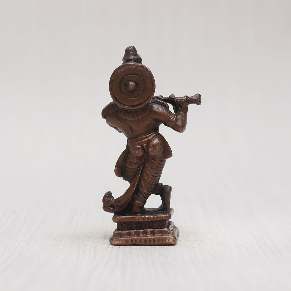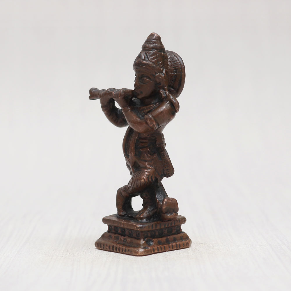 Buy a Copper Krishna Statue online that is handcrafted by skilled Indian artisans using high-quality copper. Standing gracefully on a platform, Lord Krishna is depicted playing his divine flute, with his legs crossed in a serene and enchanting pose. The vintage-style finish adds a touch of timeless elegance to this divine creation. This Copper Krishna Statue is not only a perfect addition to your prayer room at home, but it also enhances the ambiance of offices, restaurants, cafes, and shops, exuding an aura of spiritual tranquillity. The intricate detailing captures the essence of Lord Krishna's divine beauty, making it an ideal item for exhibitions, decorations, and collections. Additionally, this exquisite deity can be reverently placed in temples for worship, creating a sacred space for spiritual devotion. The statue serves as an ideal gift for loved ones on special, festive, or auspicious occasions, symbolizing love, blessings, and prosperity.