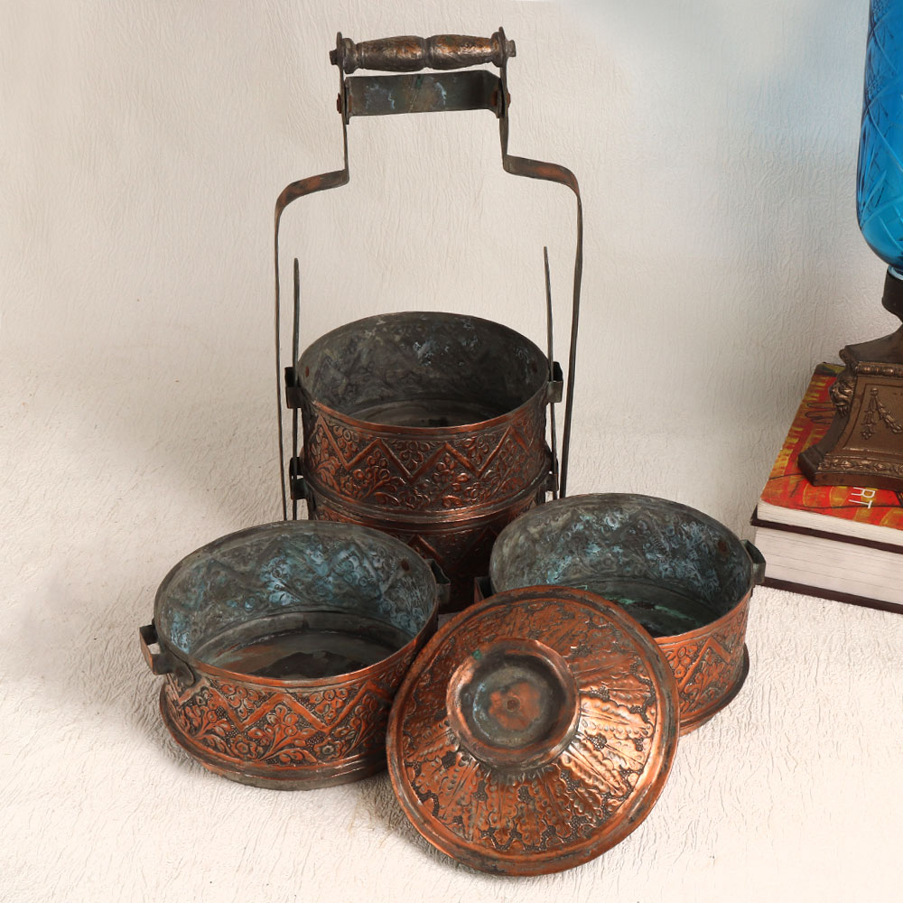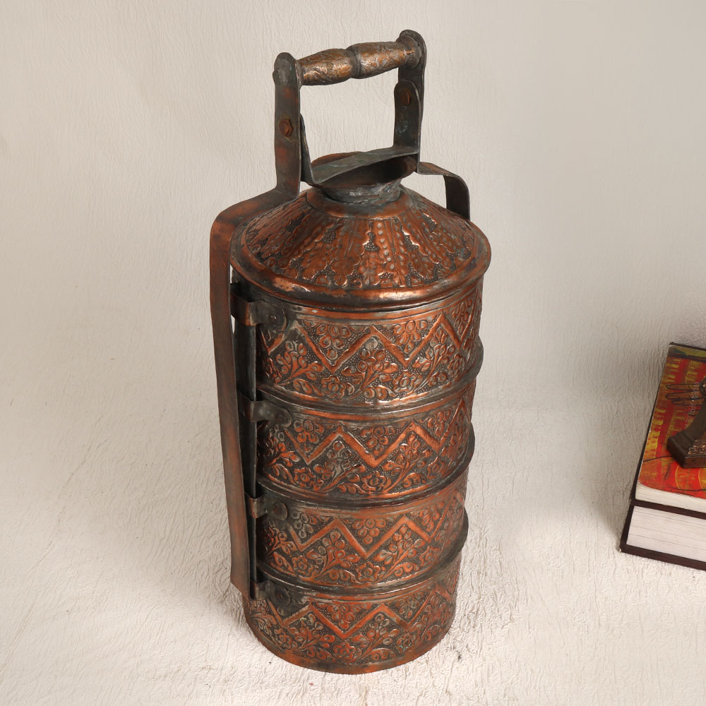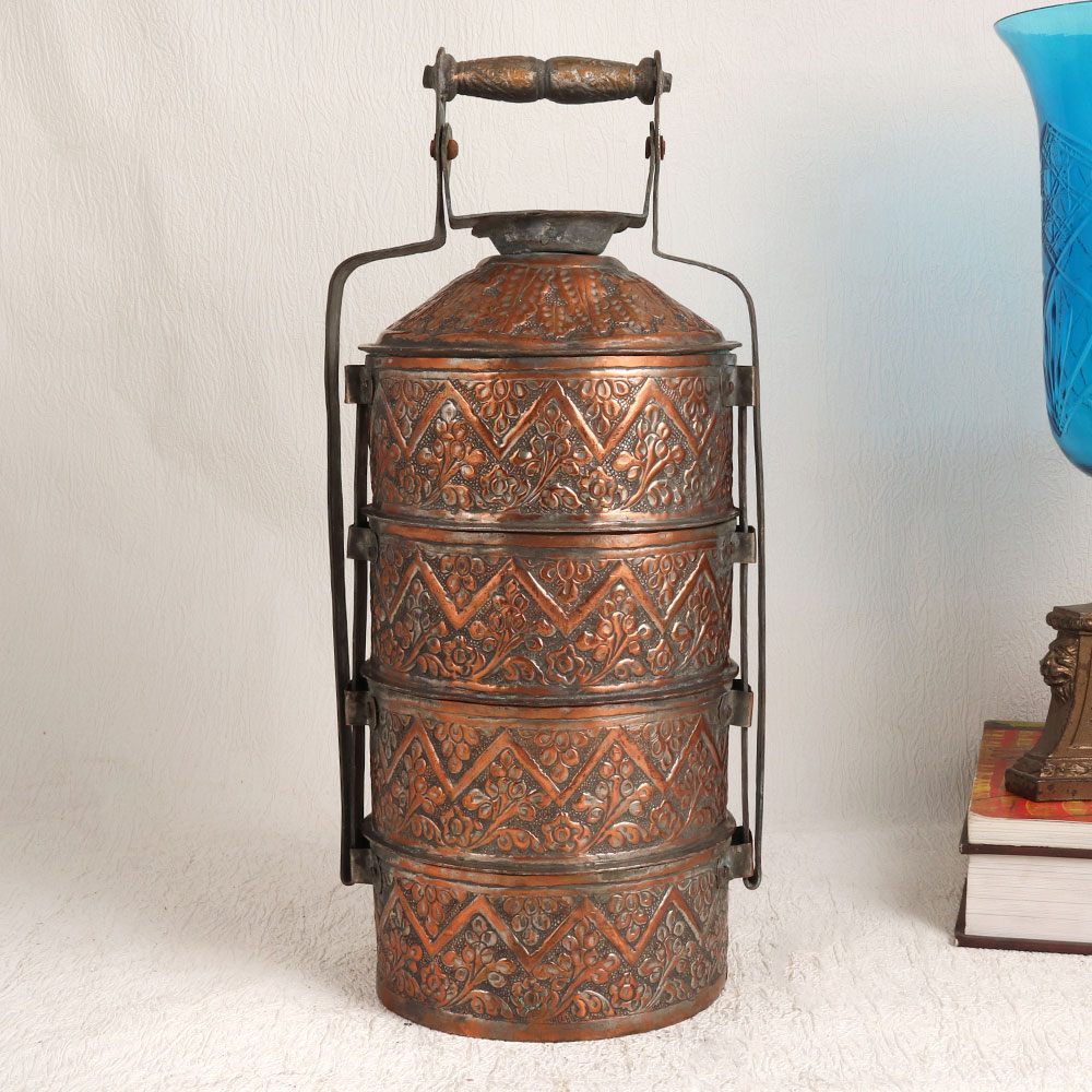 A vintage Tiffin box which is a true testament to the craftsmanship of professional Indian artisans. Crafted in the traditional Islamic Art style, this Tiffin box is a masterpiece in antique brown finish, made from high-quality copper. Its intricate carving showcases the rich heritage of India's artisanal traditions, making it a unique and captivating piece. This Tiffin box is designed with four compartments, adding functionality to its beauty. However, given its vintage nature, we recommend using it primarily for decorative purposes. Place it in your home, office, restaurant, hotel, cafe, or shop to instantly infuse a touch of antique elegance. It also makes for a remarkable addition to any vintage collection, further enhancing its value. For those looking to bestow a special gift, this vintage Tiffin box is a thoughtful choice. Celebrate special, festive, or auspicious occasions by gifting it to your loved ones.