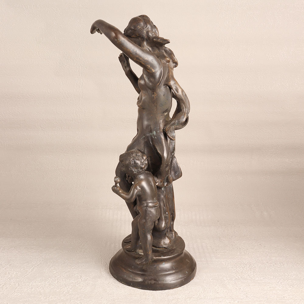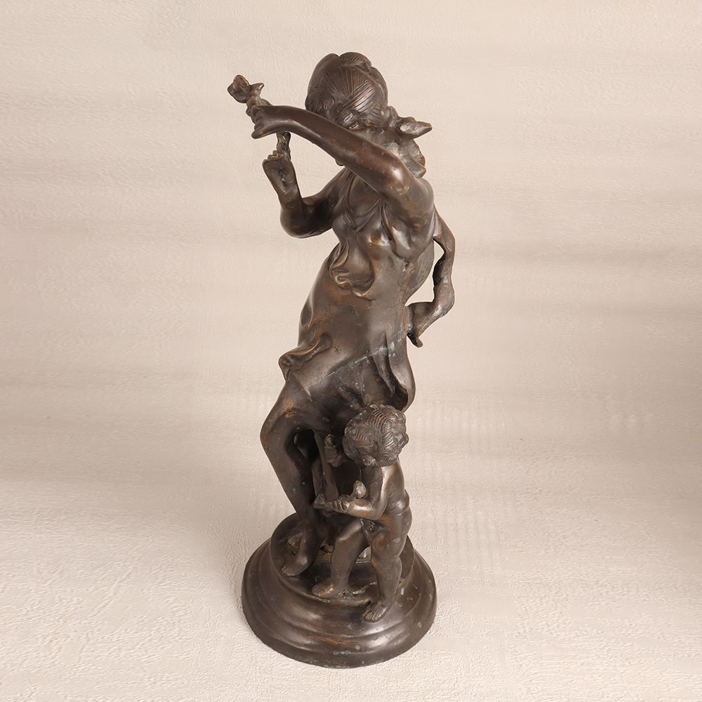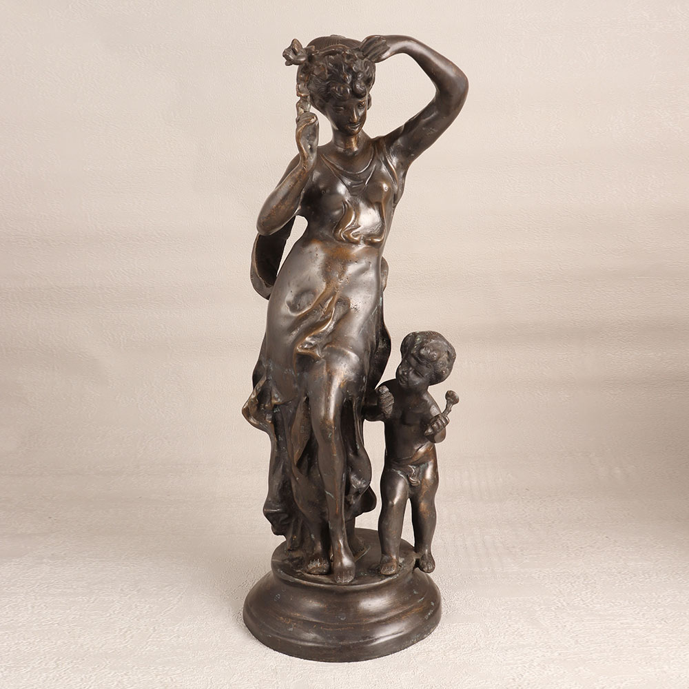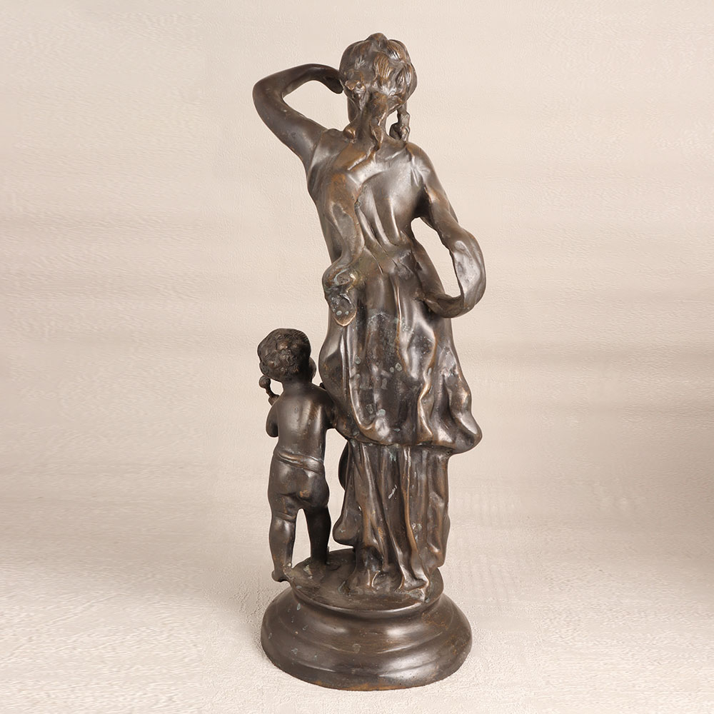 A brass statue of a Woman and Child delicately standing on a pedestal. Crafted by talented artisans with meticulous attention to detail, this stunning piece boasts a rich antique gray finish that exudes classic charm and sophistication. This handcrafted masterpiece is the embodiment of craftsmanship and artistry, making it a treasured addition to any setting. Whether you choose to place it in your home, office, hotel, cafe, shop, or restaurant, it will undoubtedly become a captivating focal point that sparks conversation and admiration. For collectors of vintage and antique items, this brass statue is a must-have, adding a touch of history and character to your collection. It's equally suited for exhibitions, where its intricate design and superior quality will be a highlight. Beyond decoration and collecting, this statue makes for an exceptional gift for your loved ones on special, festive, or auspicious occasions.