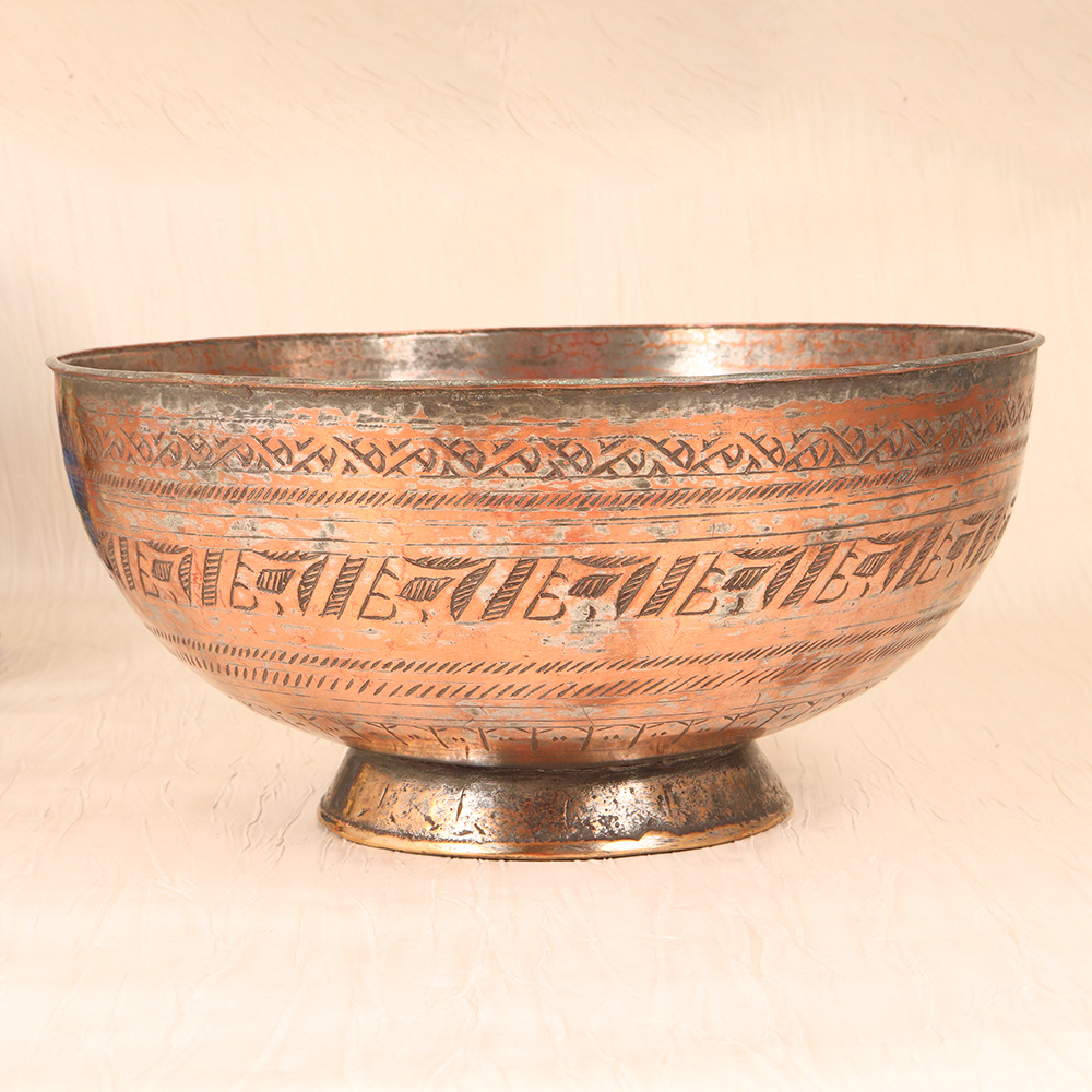 This exquisite vintage copper bowl is a masterpiece of Peshawari Art, a centuries-old tradition celebrated for its stunning, intricate designs. Meticulously handcrafted, this piece showcases the skilled artistry of master coppersmiths, with delicate Islamic calligraphy and geometric patterns adorning its surface. More than just a beautiful objet d'art, this bowl is a functional piece that can elevate the look and feel of any space. Use it to hold trinkets, serve appetizers, or simply let it shine as a captivating focal point. The high-quality copper construction ensures exceptional durability, while the warm, rich tones lend an air of timeless sophistication. Whether you're a collector of fine Islamic art, a lover of unique home decor, or simply someone who appreciates the beauty of well-crafted functional pieces, this vintage copper bowl is a must-have addition to your space. Infuse your home with the cultural elegance of Peshawari Art and let this stunning bowl become a cherished centerpiece that sparks conversation and wonder.