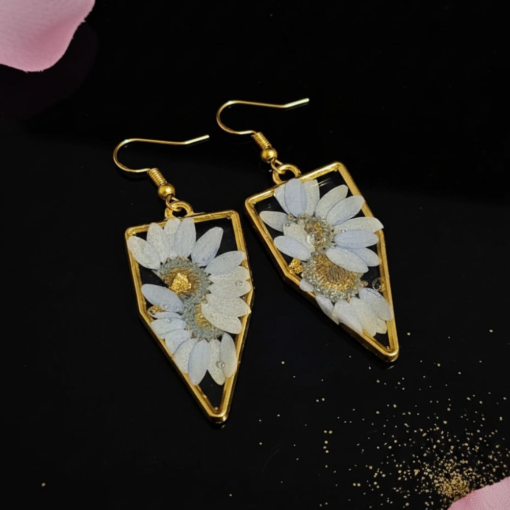 Discover elegance in simplicity with our light blue daisy triangle earrings. A real bloom floats in translucent resin inside a golden triangular frame, perfect for those who cherish understated beauty. Packed & quality-checked by Indianshelf.