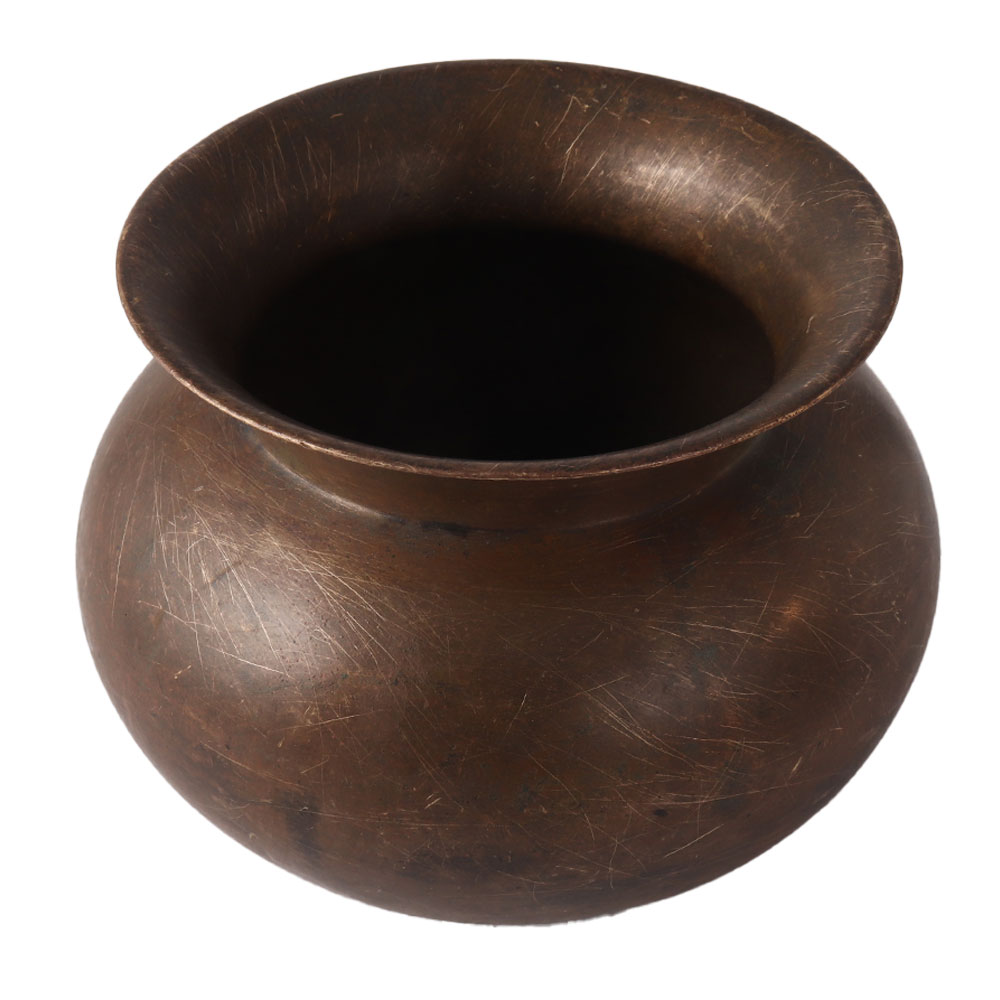 This unique round brass pot is perfect for a collection, individual gifts, interior design projects for homes and hotels, Diwali gifts, anniversary gifts, and housewarming presents. It is finished in a deep patina.