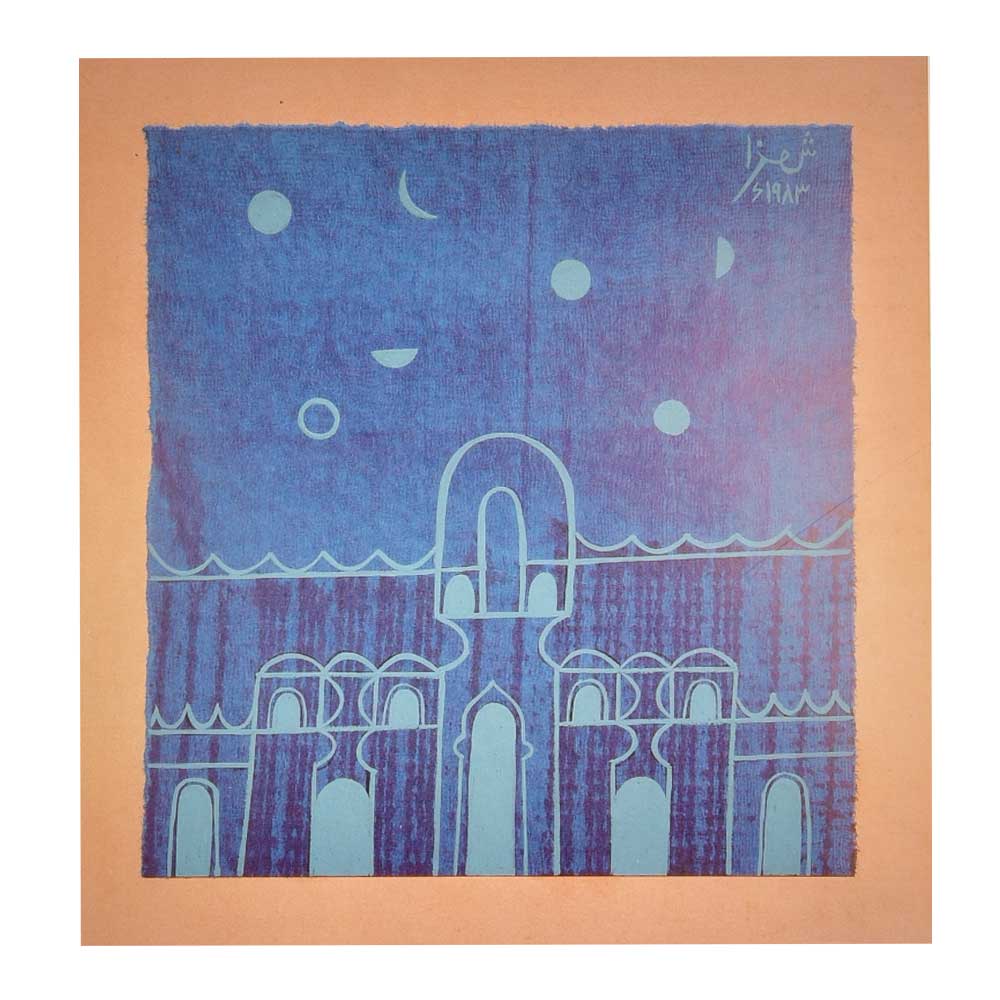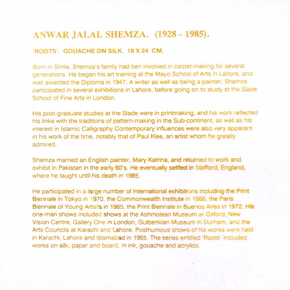 Anwar Jalal Shemza was an artist and writer active in Pakistan and later the United Kingdom.Despite being better known as an artist .Shemza was initially influenced by Modernism most notably Paul Klee although later works also showed a traditional Islamic influence. He was also an accomplished printmaker, having his work exhibited at the International Print Biennial in Tokyo.His Roots series started in the 1970s and showed imaginary plants and roots derived from Arabic script below.