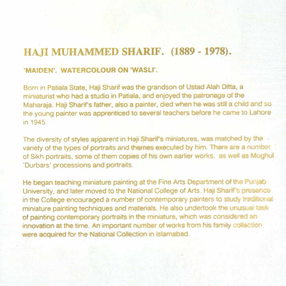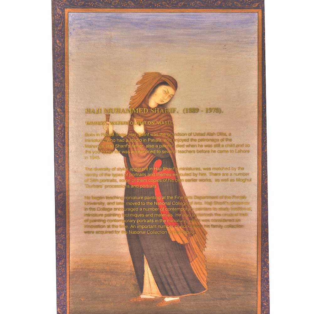 Ustad Haji Mohammad Sharif is a known master of miniature painting, a tradition strongly patronized by the Mughals. Born in 1889 in Patiala state, East Punjab, he inherited this art form from his forefathers who were also established miniaturists of their own times.