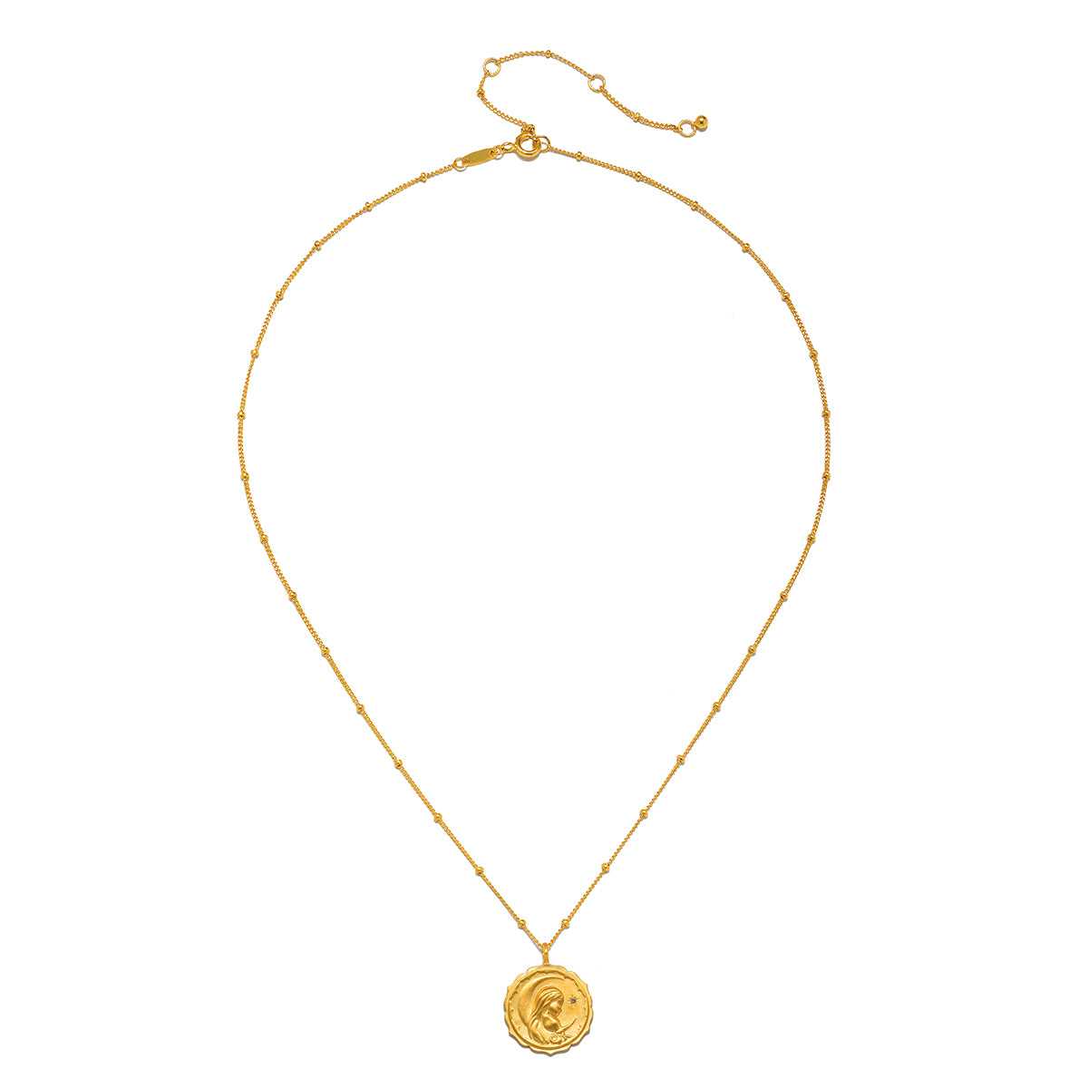 This Protective Goddess Gold Necklace brings together spiritual symbolism, radiant craftsmanship, and subtle modern elegance. Crafted from brass and finished in a rich 22K gold plating, the necklace features a Goddess-inspired pendant detailed with brilliant white CZ stones that add a touch of divine sparkle. At 18 inches, it sits beautifully at the collarbone—making it both a meaningful and stylish everyday accessory. Handcrafted by artisans, this necklace blends protection, femininity, and warm golden shine.