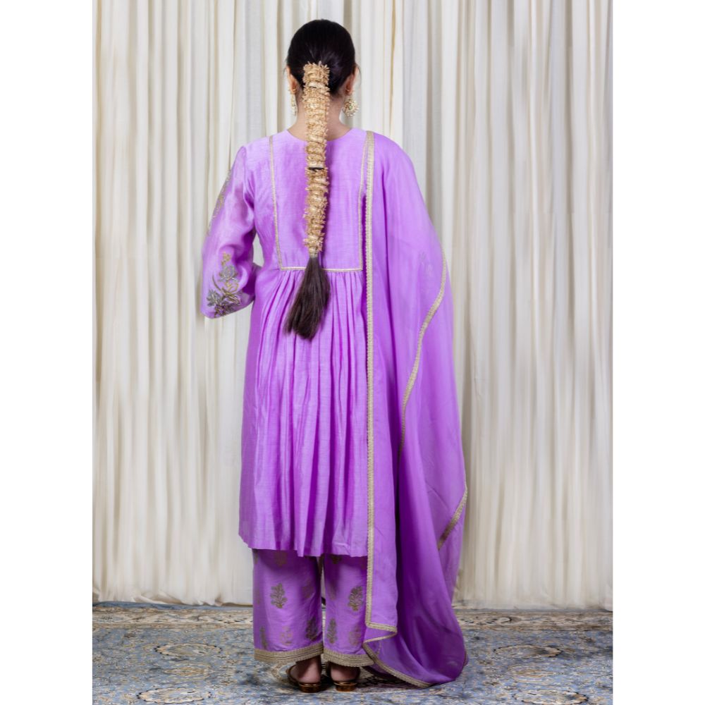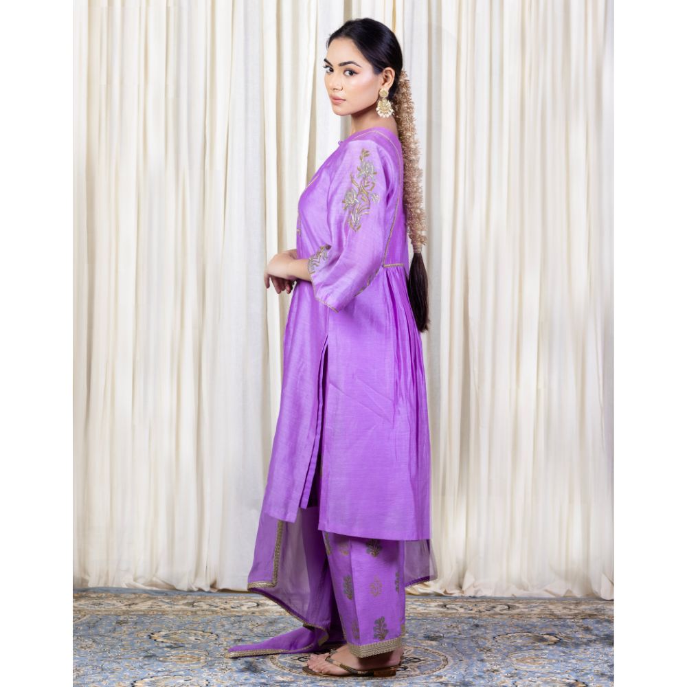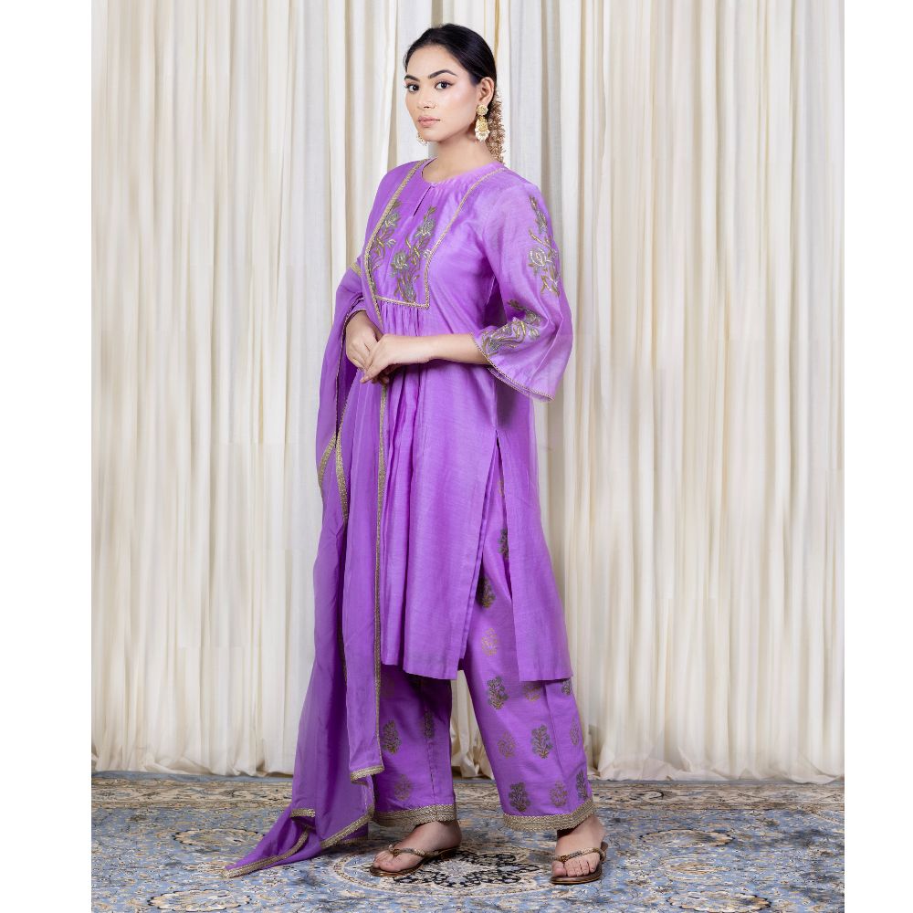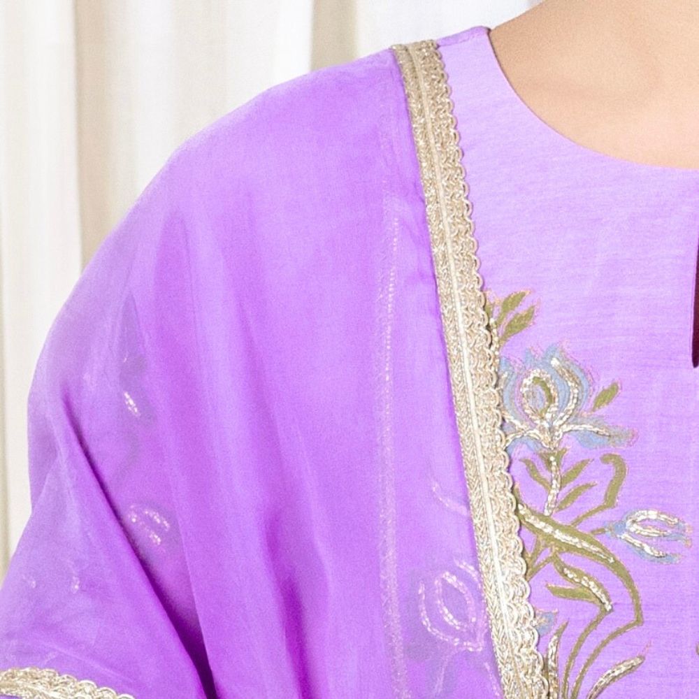 Make a bold yet graceful statement with this Purple Gathered Kurta Set, exquisitely crafted from pure cotton Chanderi and enriched with traditional hand embroidery and block prints. The kurta features a softly gathered silhouette with intricate floral embroidery on the yoke and sleeves, exuding artisanal elegance. Its vibrant purple hue adds a festive flair, making it a perfect pick for poojas, wedding functions, or celebratory gatherings. Paired with comfortable cotton silk bottoms adorned with coordinated block prints and delicate trims, the set ensures both comfort and sophistication. The look is completed with a lightweight viscose organza dupatta that drapes effortlessly, highlighted with embroidered borders to add a luxurious finish. This handcrafted ensemble beautifully fuses Indian heritage with contemporary fashion, ideal for women who seek timeless beauty and effortless style. Pair it with juttis and traditional earrings for an ensemble that speaks of refinement and festive charm.