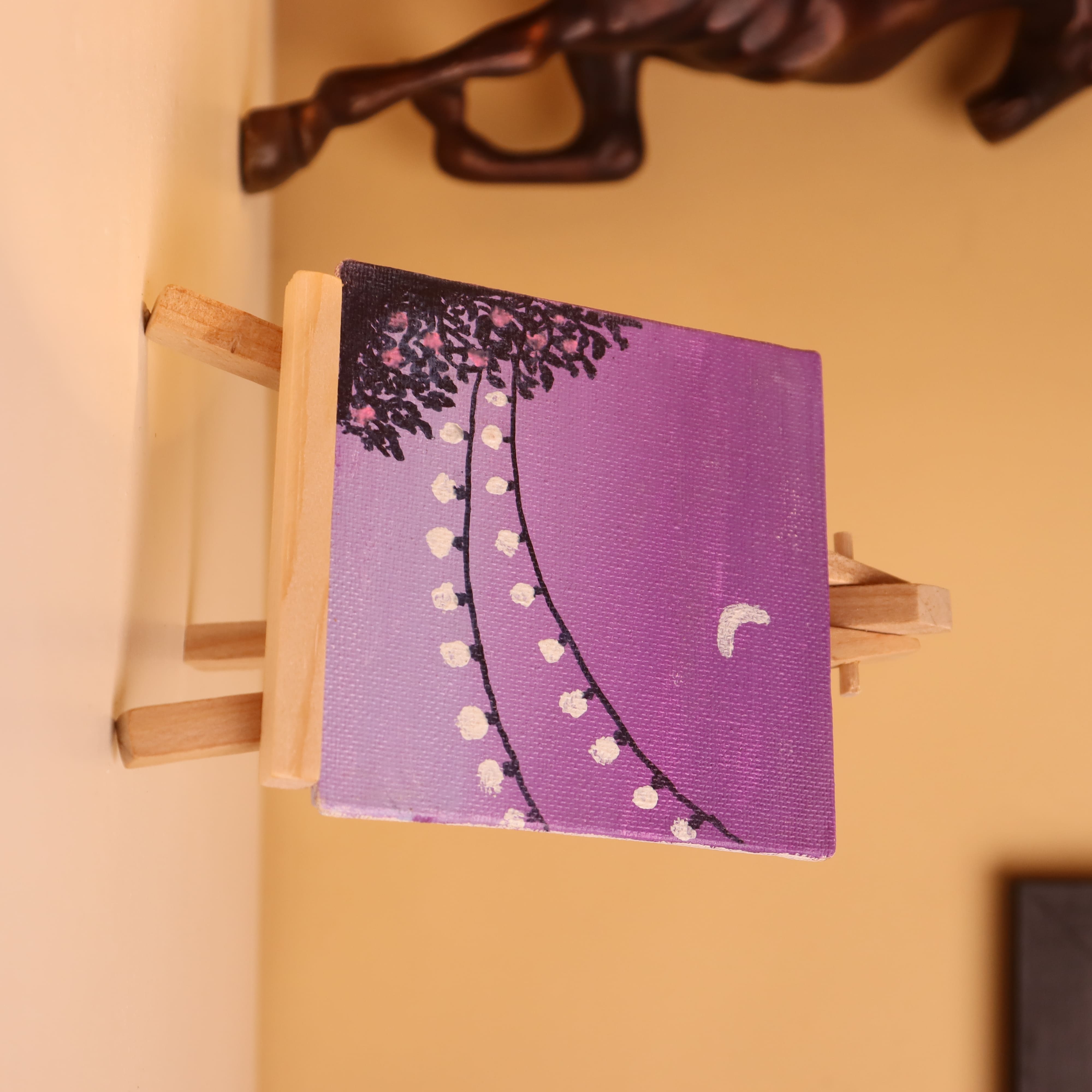 Capture the charm of magical evenings with this 4x4 inch textured canvas painting featuring a purple twilight sky adorned with glowing fairy lights. Handcrafted with raised textured paint, this mini artwork adds a tactile richness to the soft gradient background, which shifts from lavender to deep violet. Two strings of hand-painted fairy lights arc gracefully across the sky, bringing a festive warmth to the serene nighttime scene. A delicate crescent moon and dark silhouetted foliage enhance the peaceful, dreamy vibe, making it a perfect accent for cozy corners, study desks, or gift hampers. Ideal for lovers of aesthetic decor, soft lights, and handmade art, this piece is both soothing and uplifting. The small size makes it versatile and easy to display, complete with a miniature wooden easel. Whether you’re decorating a shelf or gifting to a friend, this canvas brings a quiet celebration to any space. Handmade with care and joy.