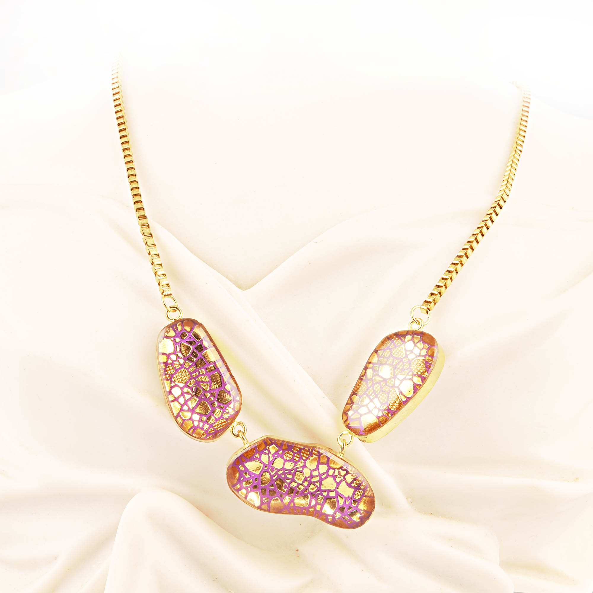 Purple with Gold Beabed Neck New Beautiful Jewellery. Resin, Glass in a Brass Chain and Brass Clasp.