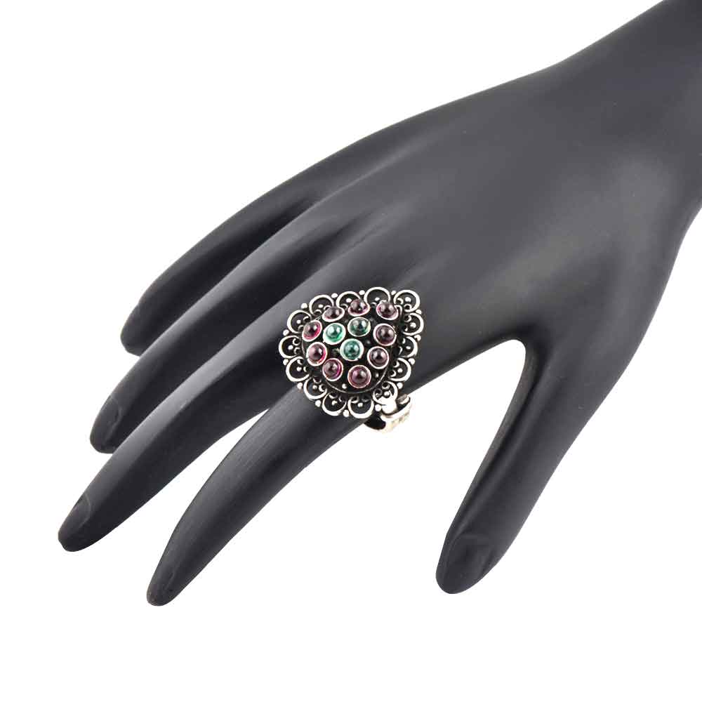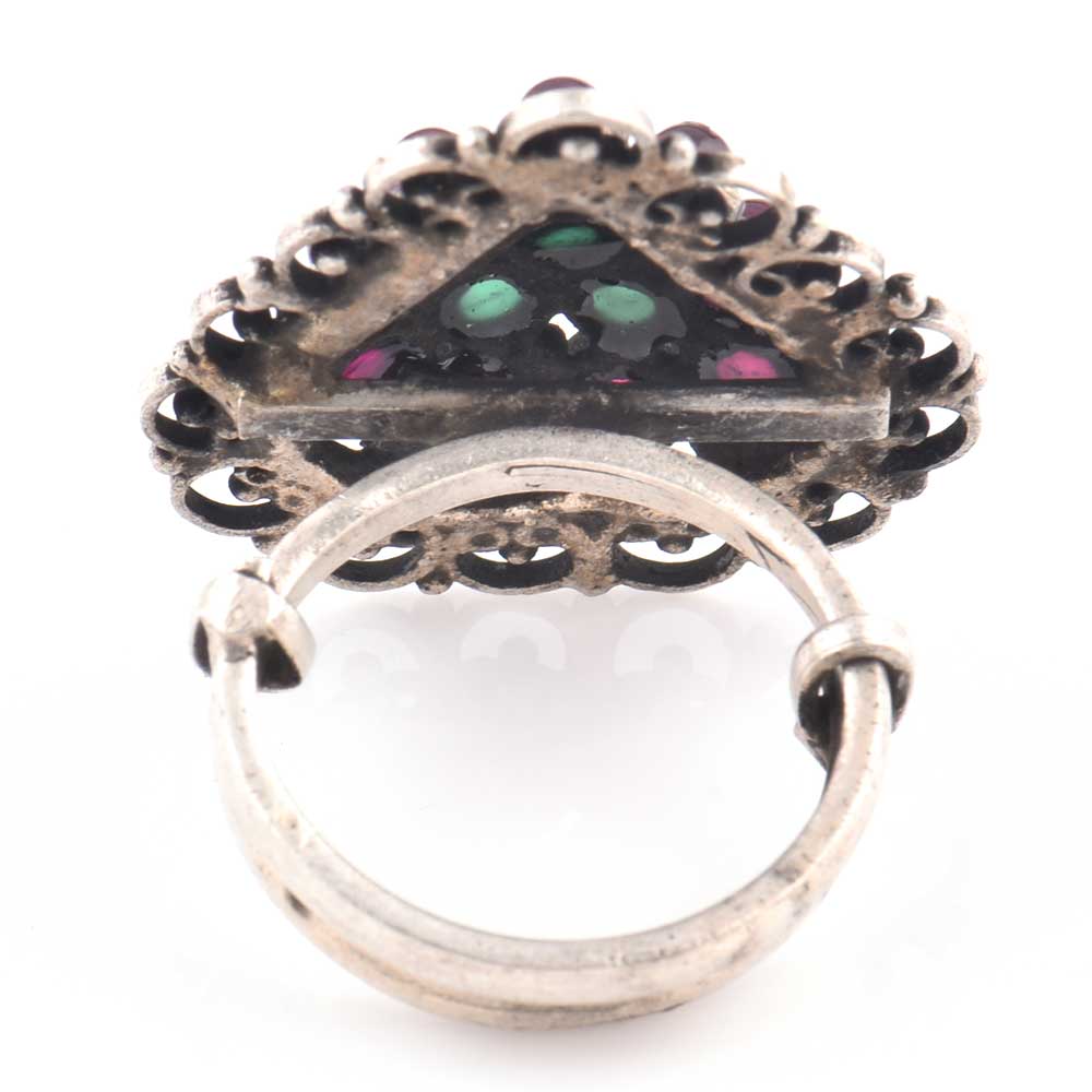 Semi Precious Oxidized Amethyst and onyx stone in 92.5 Sterling silver ring Is place in the form of a pyramid with curved half circle design on the border is made by Indian artisans. It compliments not only traditional but western attire as well.