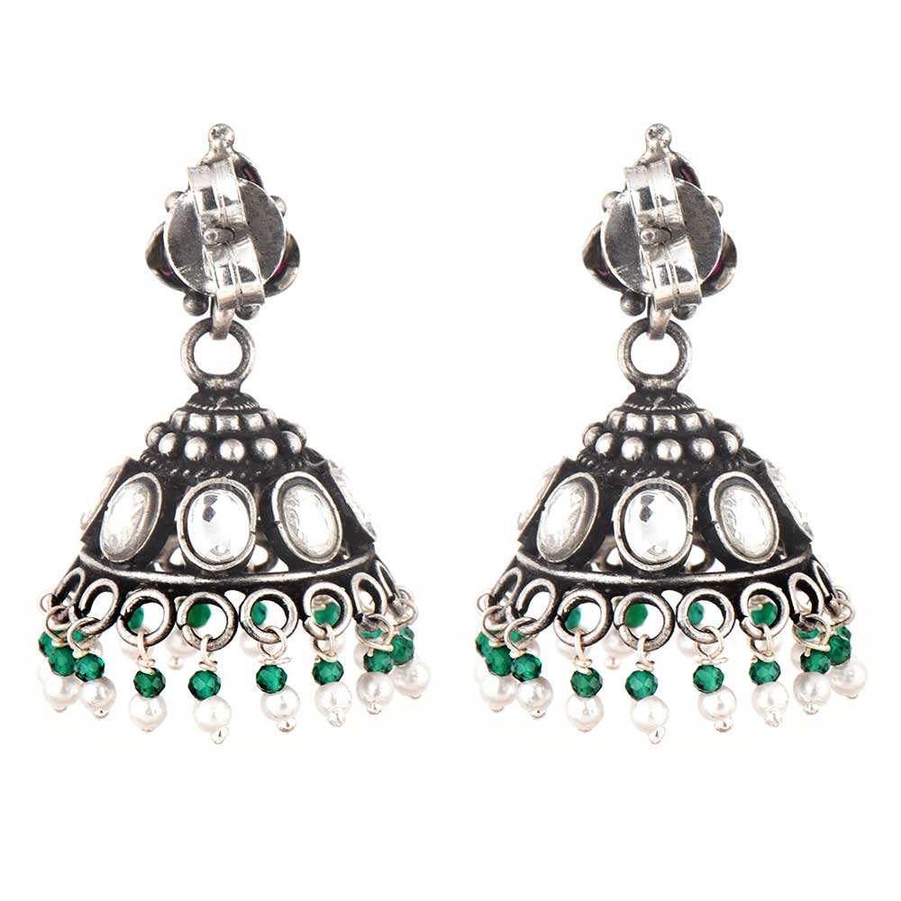 Pyramid Shaped 925 Sterling Silver Jhumki Earrings With Onyx Beads And Amethyst Stud