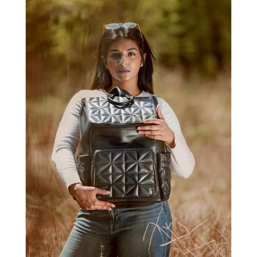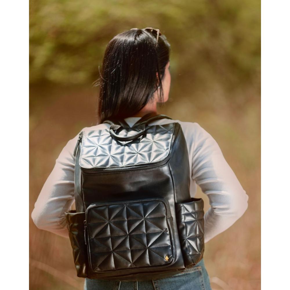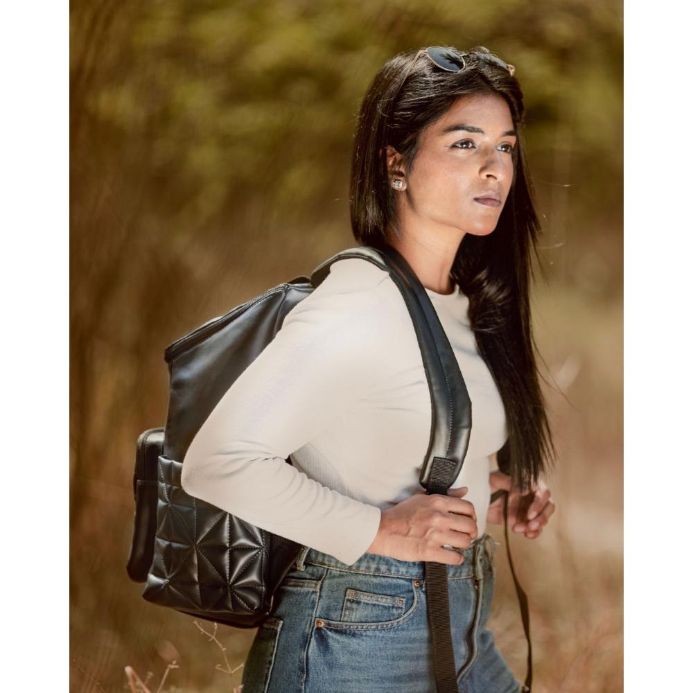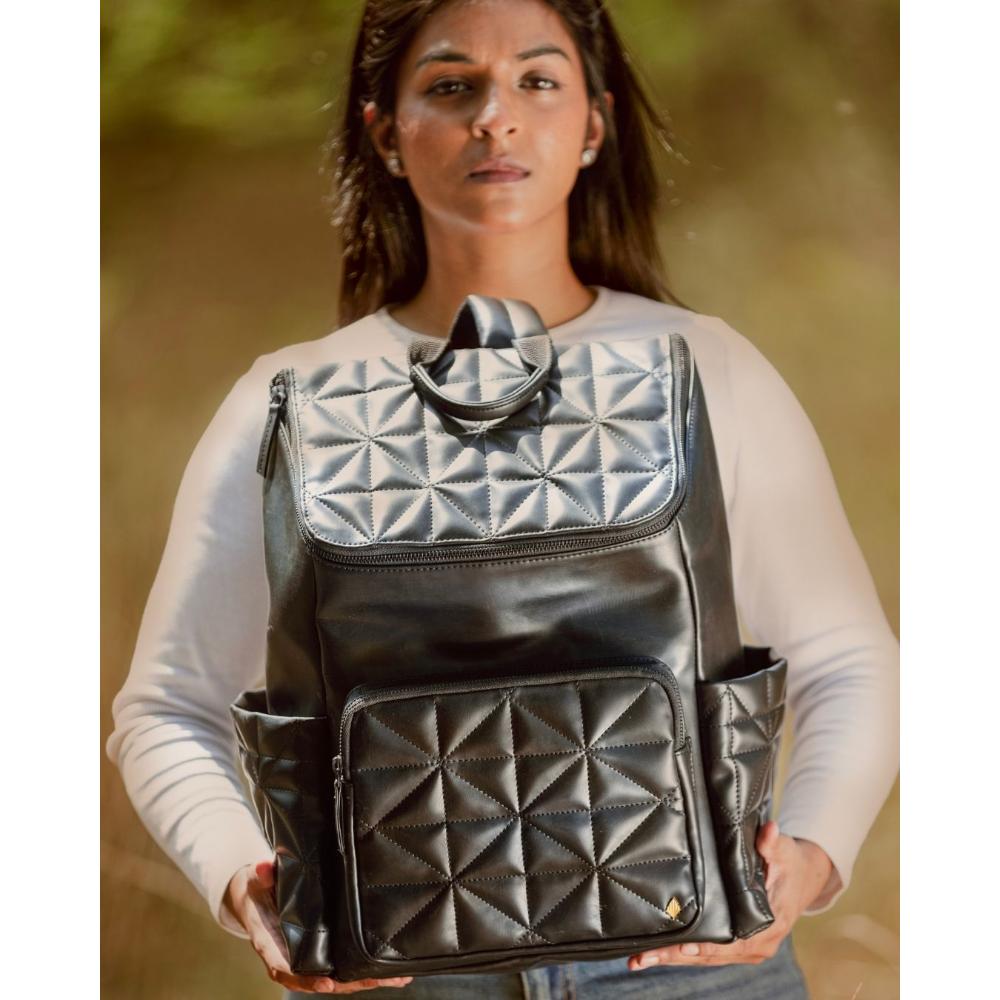 Quilted Black Vegan Leather Bagpack Artisanal Design brings a quilted into your life, inviting admiration and everyday delight. Enjoy its black hue and bagpack silhouette crafted with care.