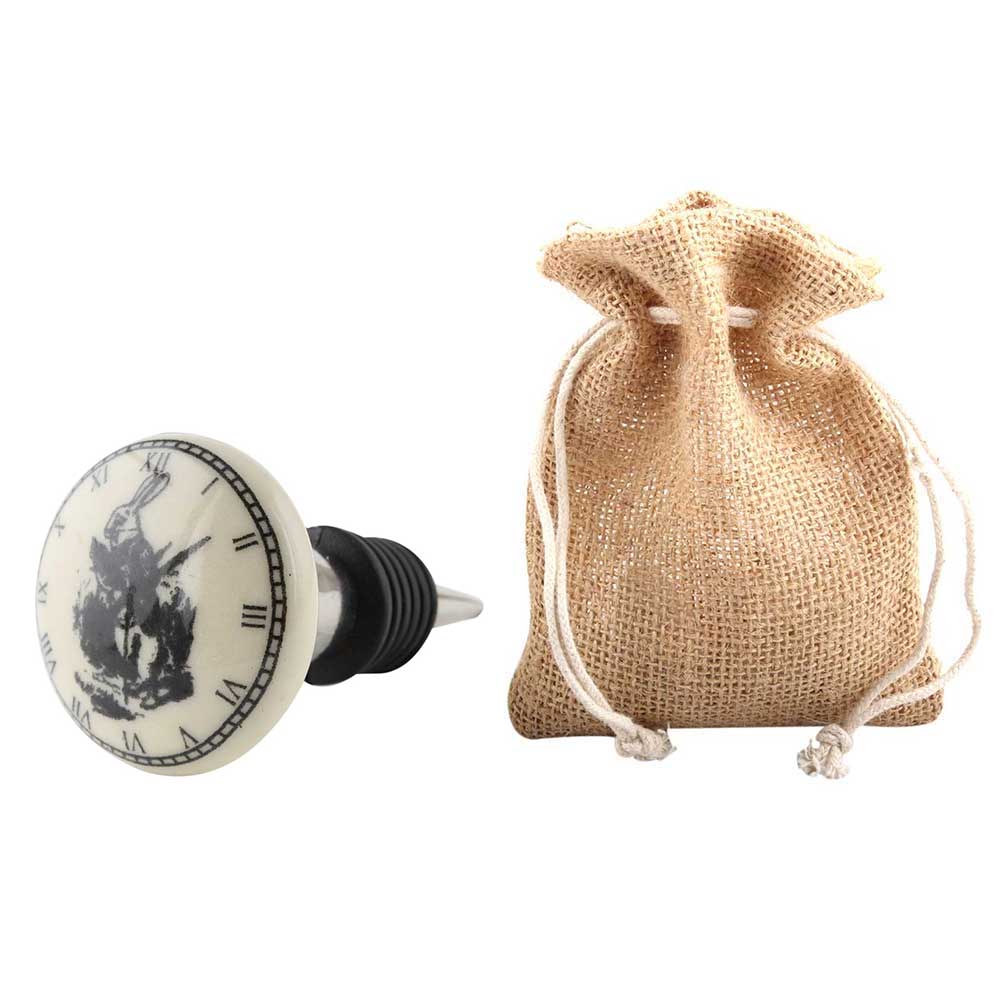 Rabbit Clock Ceramic Flat Wine Bottle Stopper. Zinc Alloy Wine Bottle Stopper with Attractive Jute Bag Packaging.