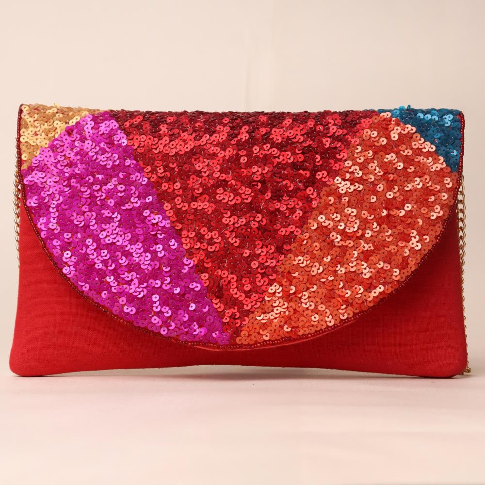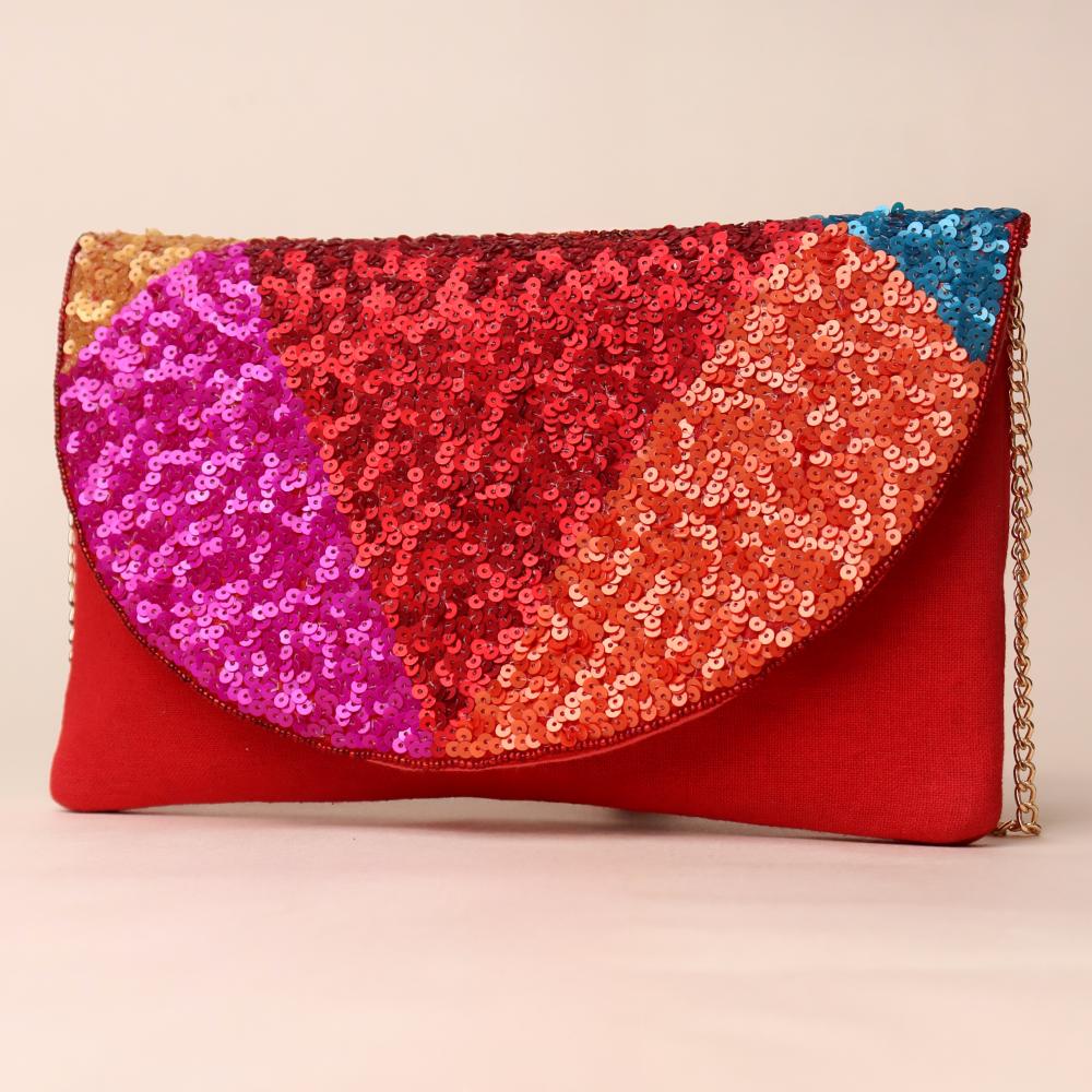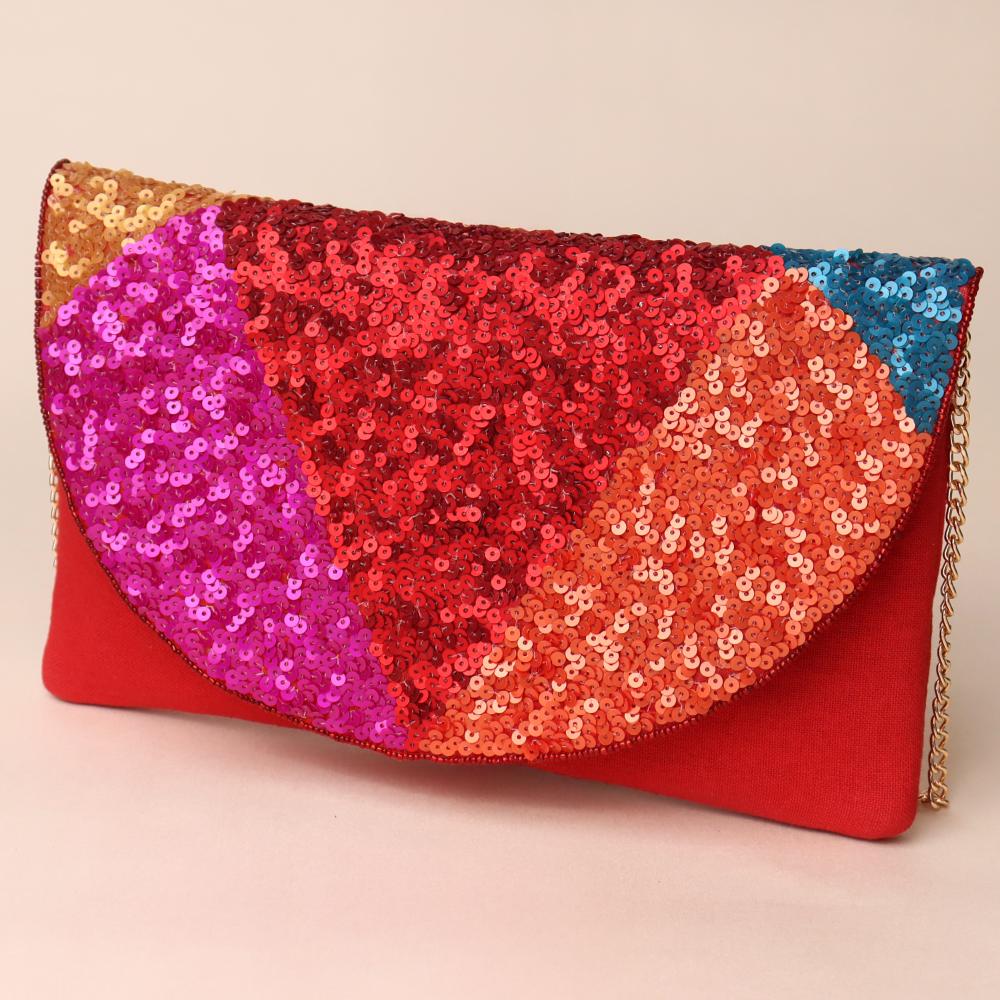 Turn heads with this dazzling sequin sling bag that bursts with vibrant energy and color. Featuring a striking semi-circular flap covered in shimmering sequins in shades of red, orange, fuchsia, gold, and teal, this bag is designed to light up any outfit. The deep red fabric base adds richness, while the gold-tone chain strap allows versatile styling—wear it as a crossbody for effortless glam or detach the chain to carry it as a statement clutch. Perfect for parties, weddings, and festive occasions.