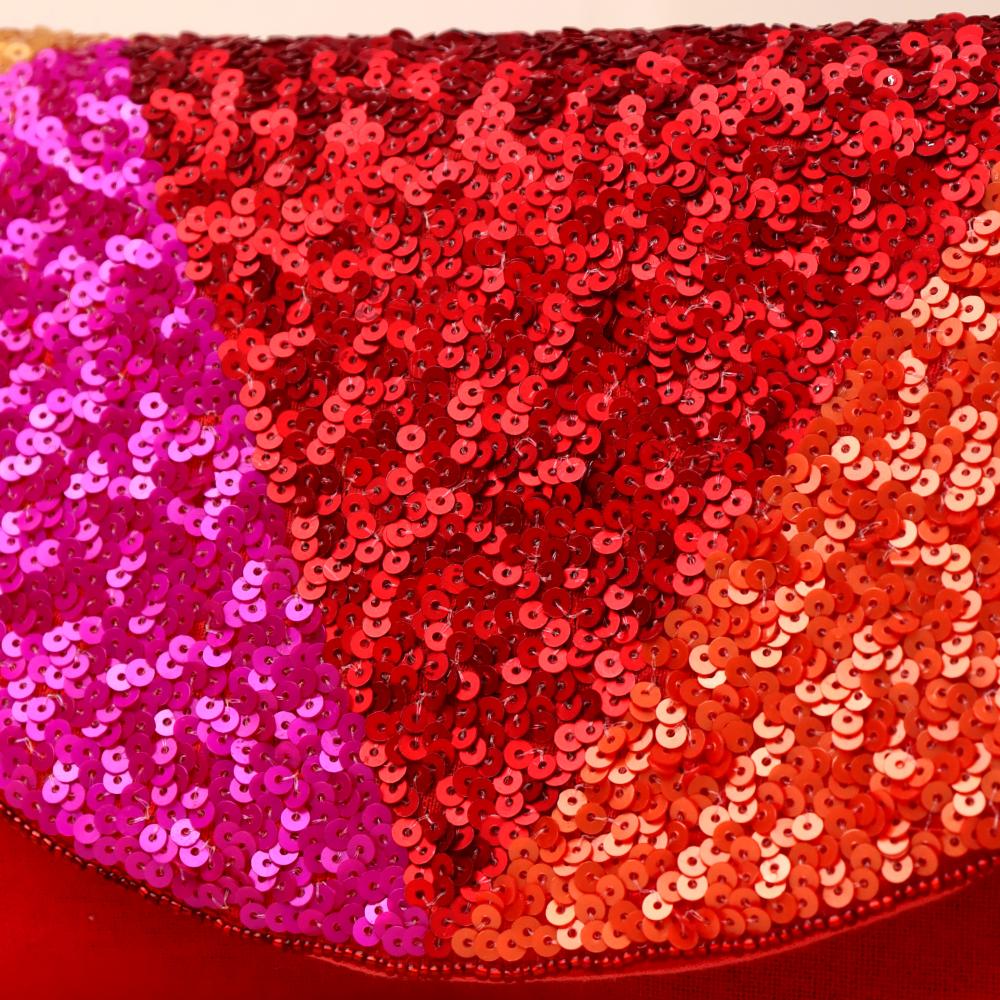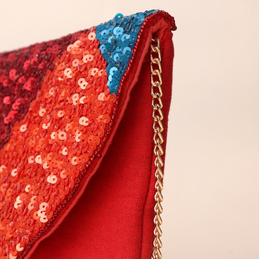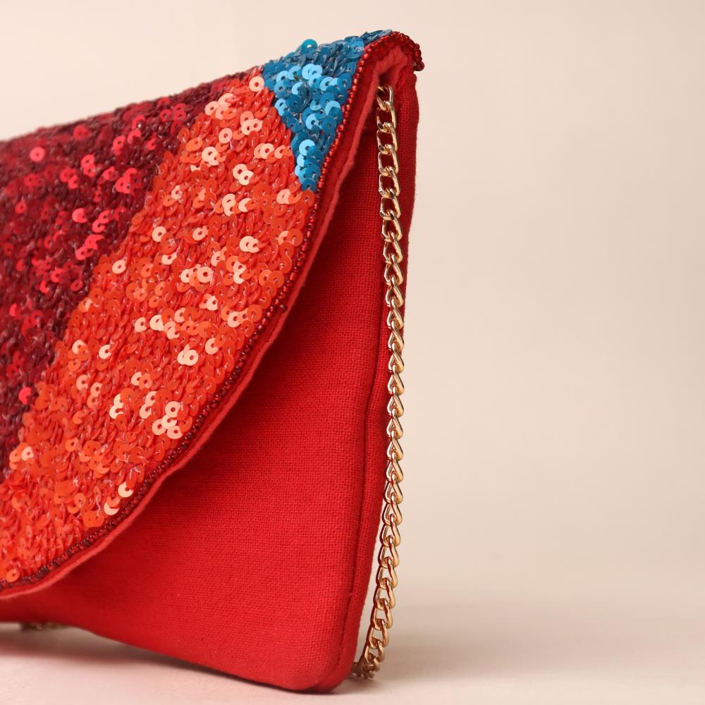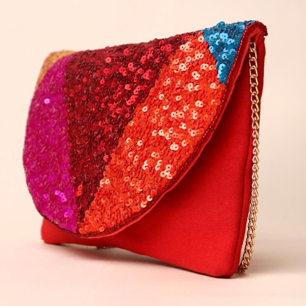 Turn heads with this dazzling sequin sling bag that bursts with vibrant energy and color. Featuring a striking semi-circular flap covered in shimmering sequins in shades of red, orange, fuchsia, gold, and teal, this bag is designed to light up any outfit. The deep red fabric base adds richness, while the gold-tone chain strap allows versatile styling—wear it as a crossbody for effortless glam or detach the chain to carry it as a statement clutch. Perfect for parties, weddings, and festive occasions.