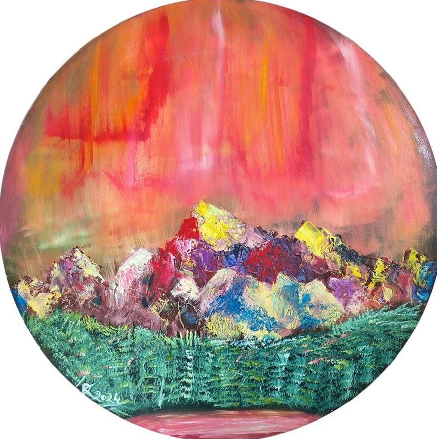 This stunning oil painting on a round stretched canvas captures a vibrant mountain landscape illuminated by a breathtaking sunset sky. The artist employs bold, textured brushwork and a vivid palette of fiery reds, warm oranges, deep purples, and lush greens to convey a powerful yet serene natural scene. Each mountain peak glows with distinct personality, while dense forest foliage grounds the composition in refreshing tranquility. Perfect for those seeking to infuse their space with warmth, dramatic beauty, and the mesmerizing allure of nature at dusk.