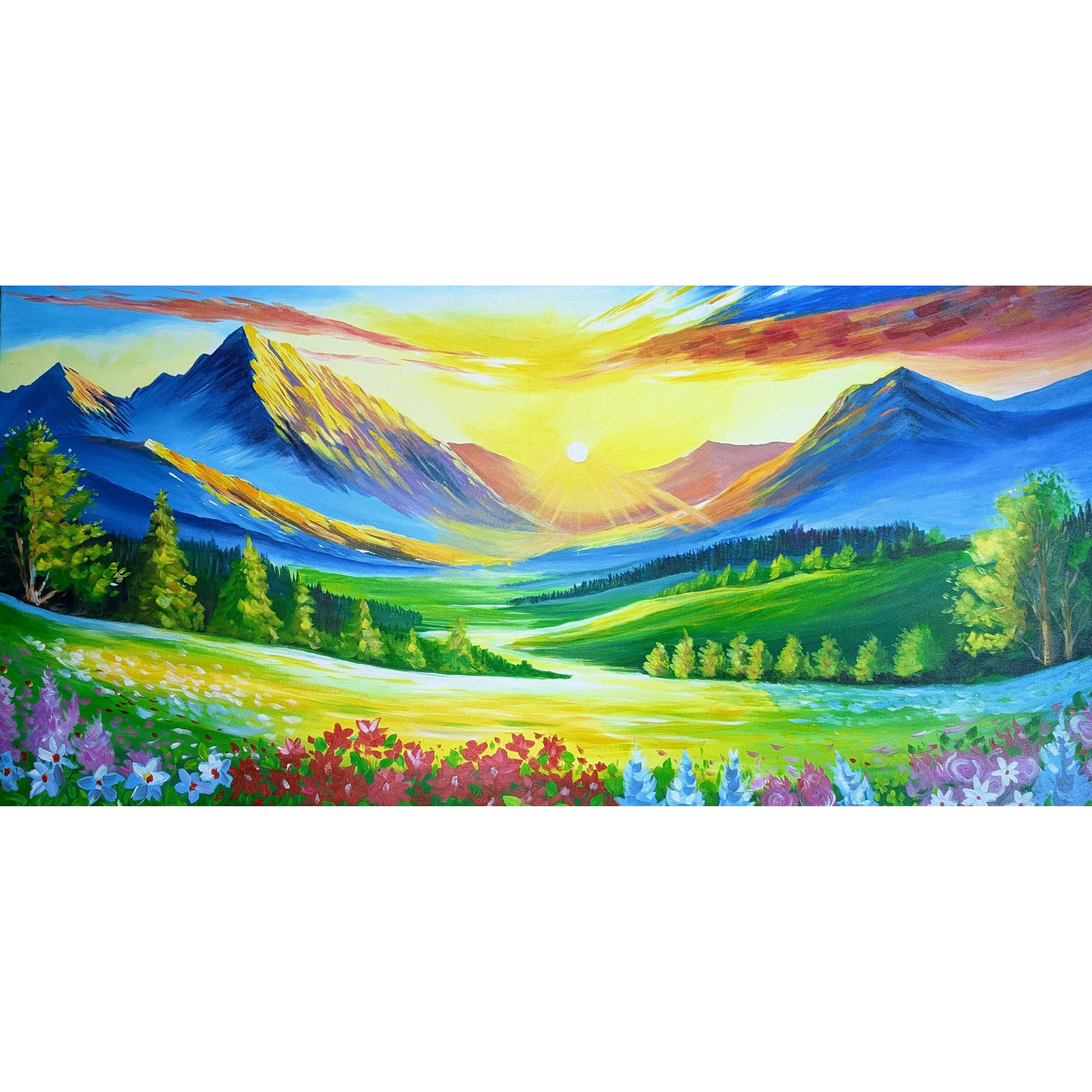 Hand-painted on high-quality canvas, this 60 x 120 cm vivid acrylic painting captures the breathtaking beauty of a mountainous landscape bathed in the golden glow of morning light. This artwork is a vibrant celebration of color and tranquility—perfect for adding warmth and elegance to your living room, hallway, or office space. Stretching across 48 inches in width, this panoramic canvas immerses you in a serene valley where wildflowers bloom in the foreground, lush green meadows roll into the distance, and majestic peaks rise to meet a glowing sky. Its wide horizontal format makes it an ideal centerpiece for a large wall, inviting viewers to pause and breathe in its peaceful energy. Due to the large size of the canvas, it is not feasible to transport it with a frame. The unstretched canvas allows the client to frame it according to their preference.