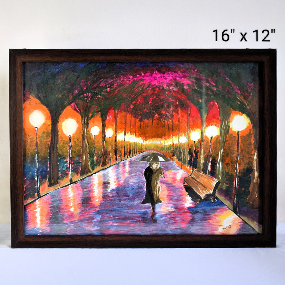 An expressive acrylic painting that captures the quiet charm of a girl walking alone under an umbrella on a rain-soaked pathway illuminated by glowing streetlights. The vivid reflections on the wet ground and the dramatic canopy of trees above create a dreamlike, cinematic atmosphere. Rendered in rich tones of orange, magenta, and indigo, this artwork evokes solitude, romance, and the beauty of rainy nights. A perfect piece for art lovers who cherish moody, reflective scenes.