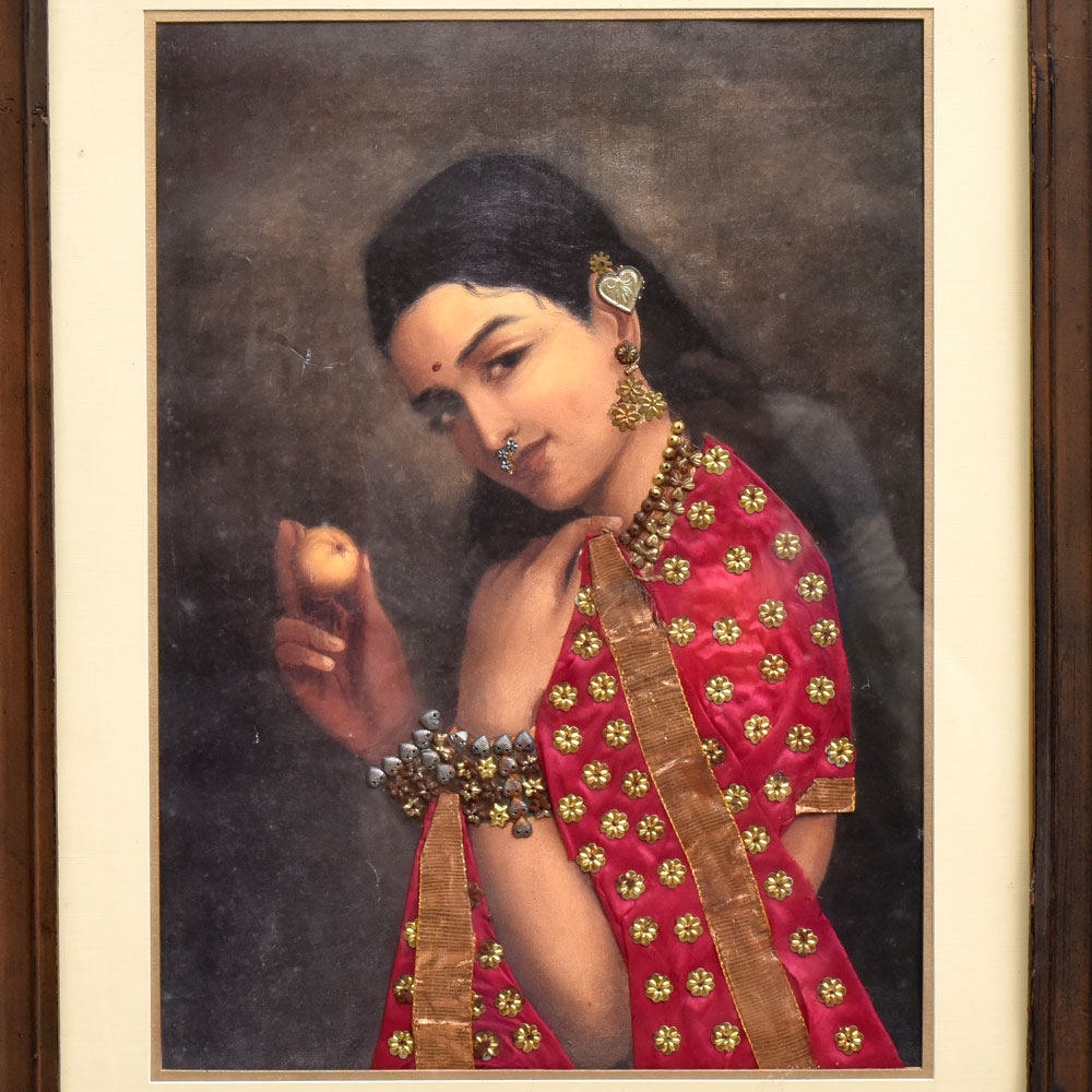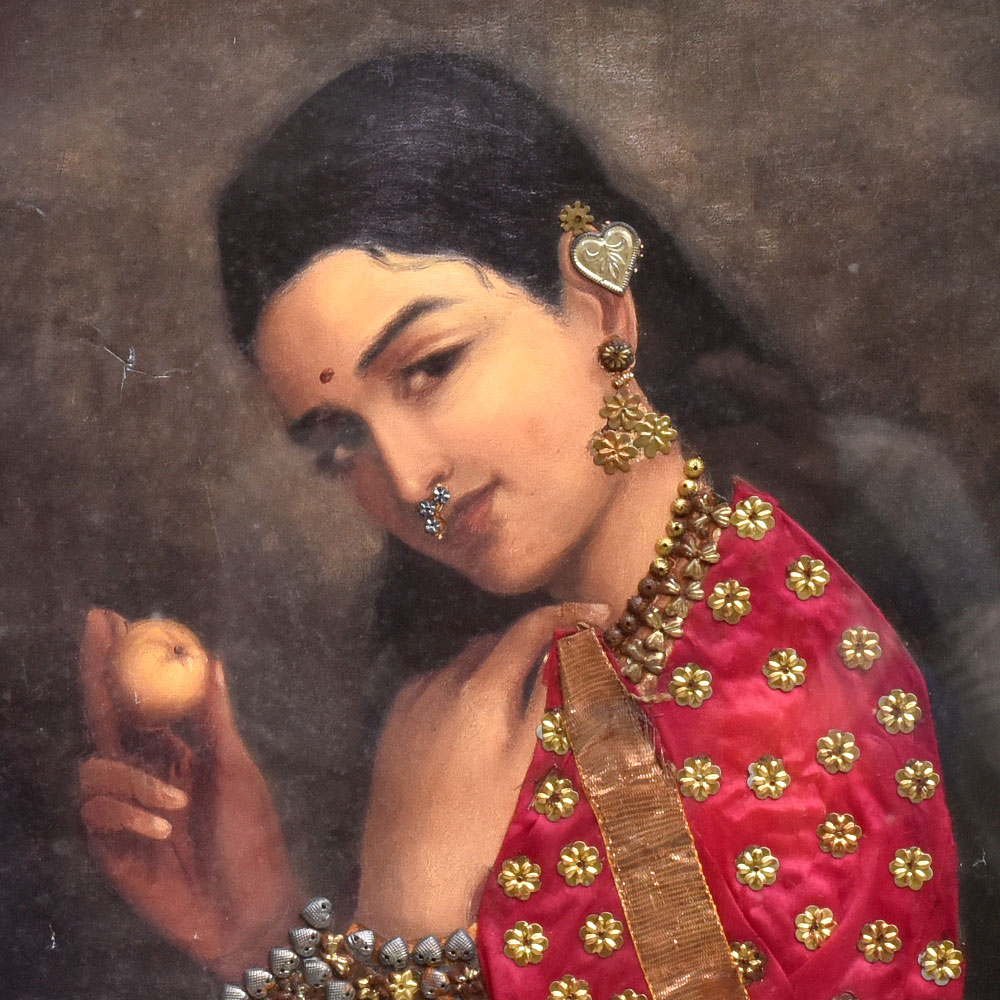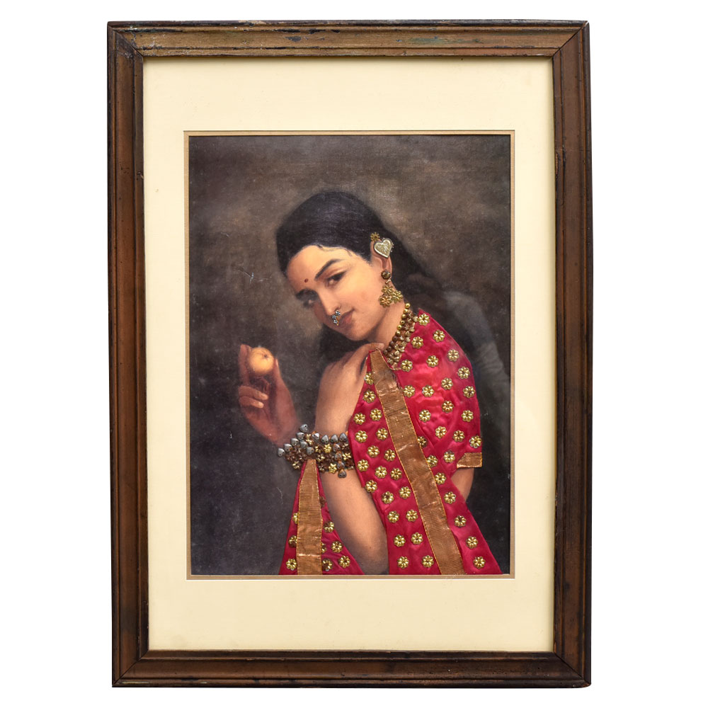 Lose yourself in the timeless elegance of this Raj Ravi Verma masterpiece. The portrait depicts a stunning woman adorned in rich, ornate clothing that commands attention. From the intricate folds of her sari to the delicate jewelry adorning her features, every element has been meticulously rendered in vivid, captivating detail. This print offers a glimpse into the renowned artist's remarkable talent for capturing the beauty and grace of the female form. Raj Ravi Verma's work is celebrated for its ability to evoke emotion and transport the viewer to another era. Displaying this piece in your home or office will infuse the space with a sense of refined sophistication and cultural appreciation. Whether you're an art aficionado or simply seeking to elevate your decor, this Raj Ravi Verma print is a must-have addition. It makes a thoughtful gift for birthdays, housewarmings, or any occasion where you want to leave a lasting impression. Immerse yourself in the timeless elegance of this stunning work of art and let it inspire your senses.
