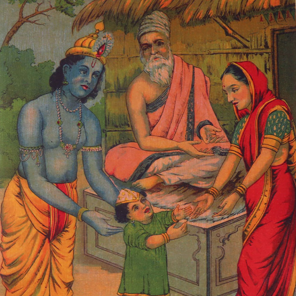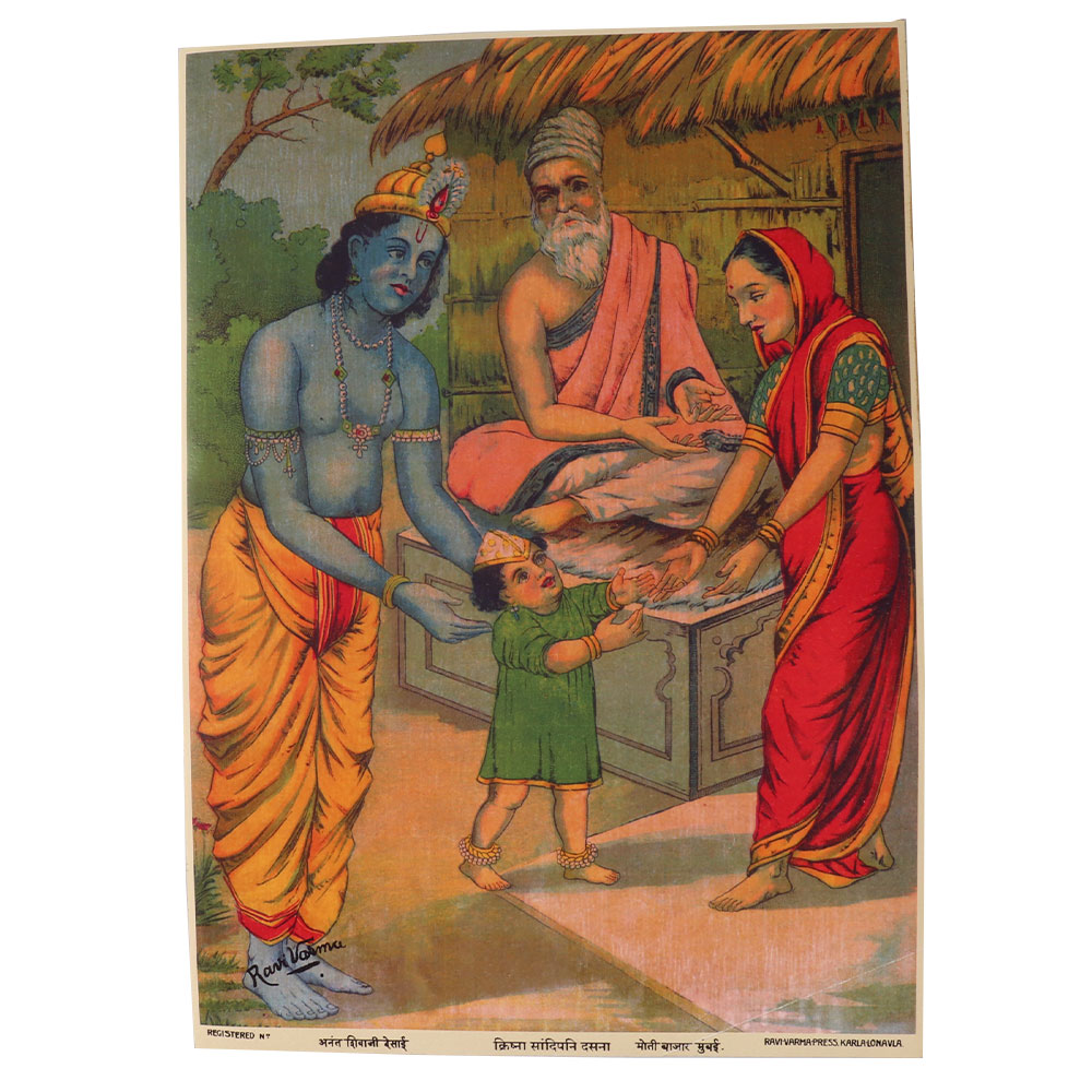 Raja Ravi Varma Paper Print Of Sandipani In Hinduism, Sandpana serves as Krishna and Balarama's guru. He is credited with educating them in all the Vedas, drawing techniques, astronomy, gandharva veda, medicine, how to train horses and elephants, and archery. According to the Harivamsha Purana, Krishna discovered that Sandipani's son had died after being sucked up by the asura Panchajana. In order to convince Yama to bring the preceptor's son back to life, Krishna and his brother travelled to Yamaloka. They were successful. He then brought his preceptor's long-lost kid from Yama's residence. The long-dead son of Sandipani reappeared in physical form thanks to Krishna, the source of unsurpassed vitality.
