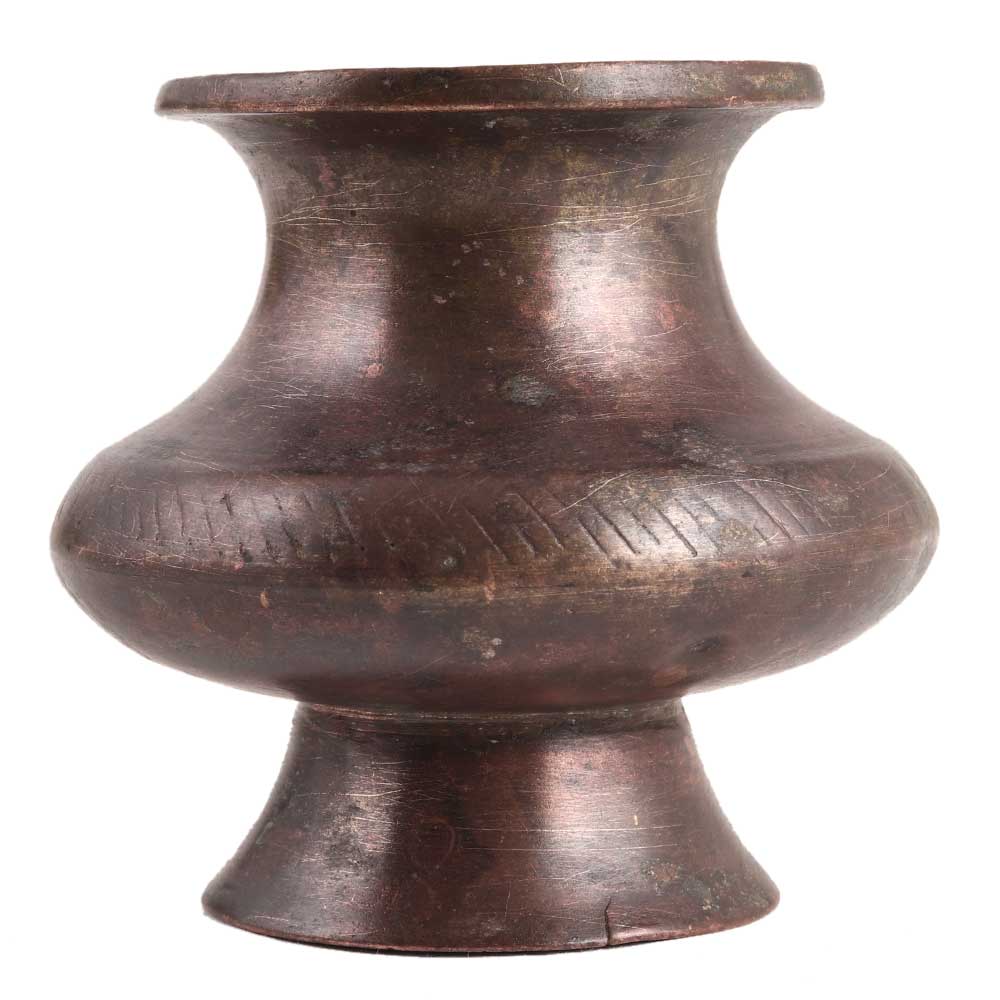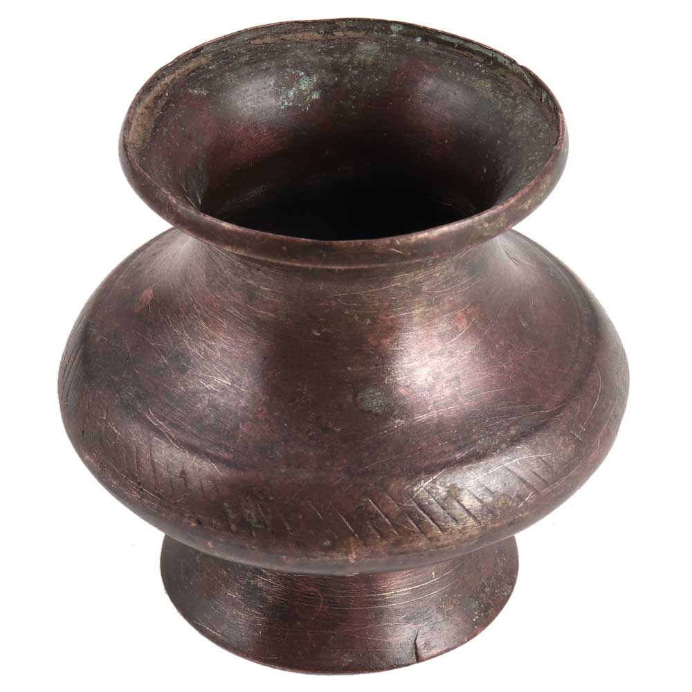 A rust proof brass flower pot or vase in the style of the Middle East has a bulge in the centre, a pattern on the centre, and a circular base. It can be used as a home decoration, office display, planter pot, flower pot, or a gift for friends and family.