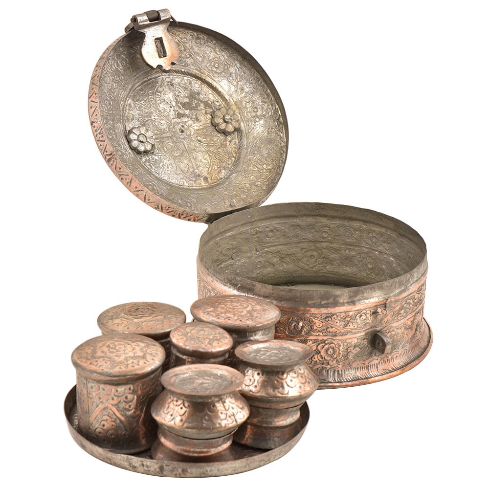A rare find in so far as it is a complete pandan box with six containers with lids together in a circular plate. This item is of copper with hand repousse work to the main body of the box. . It is can also be used as a home décor piece and gift for relatives and friends. Used for storing betel leaf, betel nut, dry tobacco, lime, catchu, and saffron.