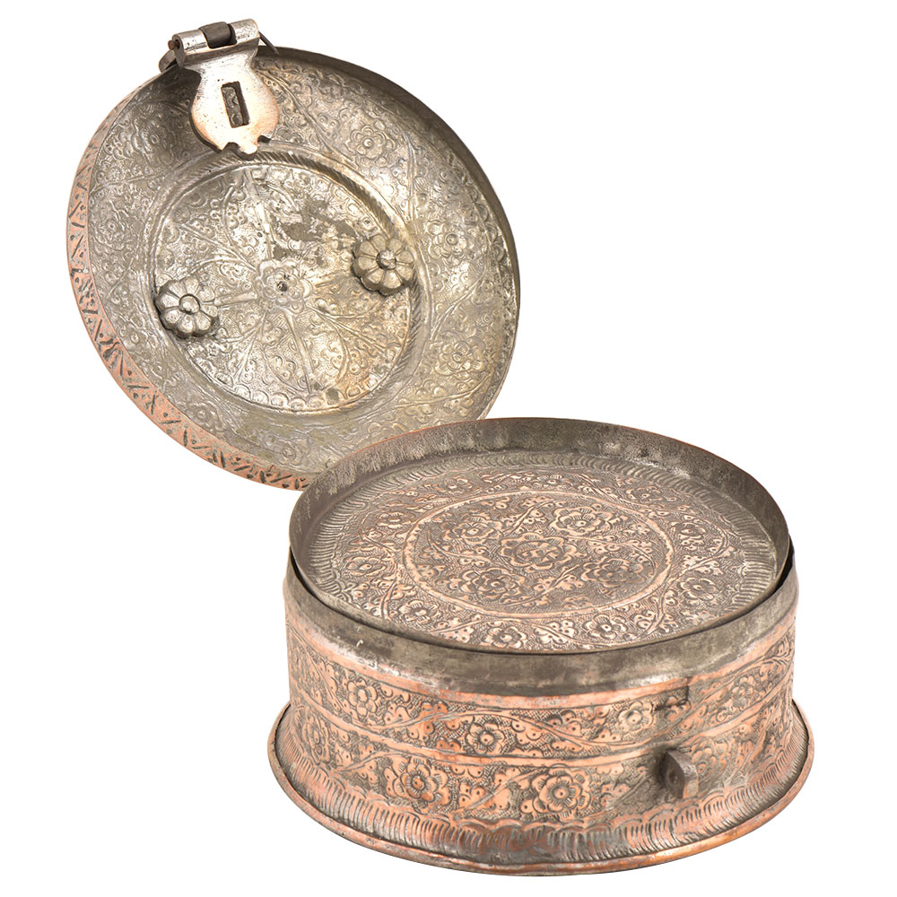 • Rare Islamic Style Embossed Copper Betel Nut Pandan Box With Lock Handle