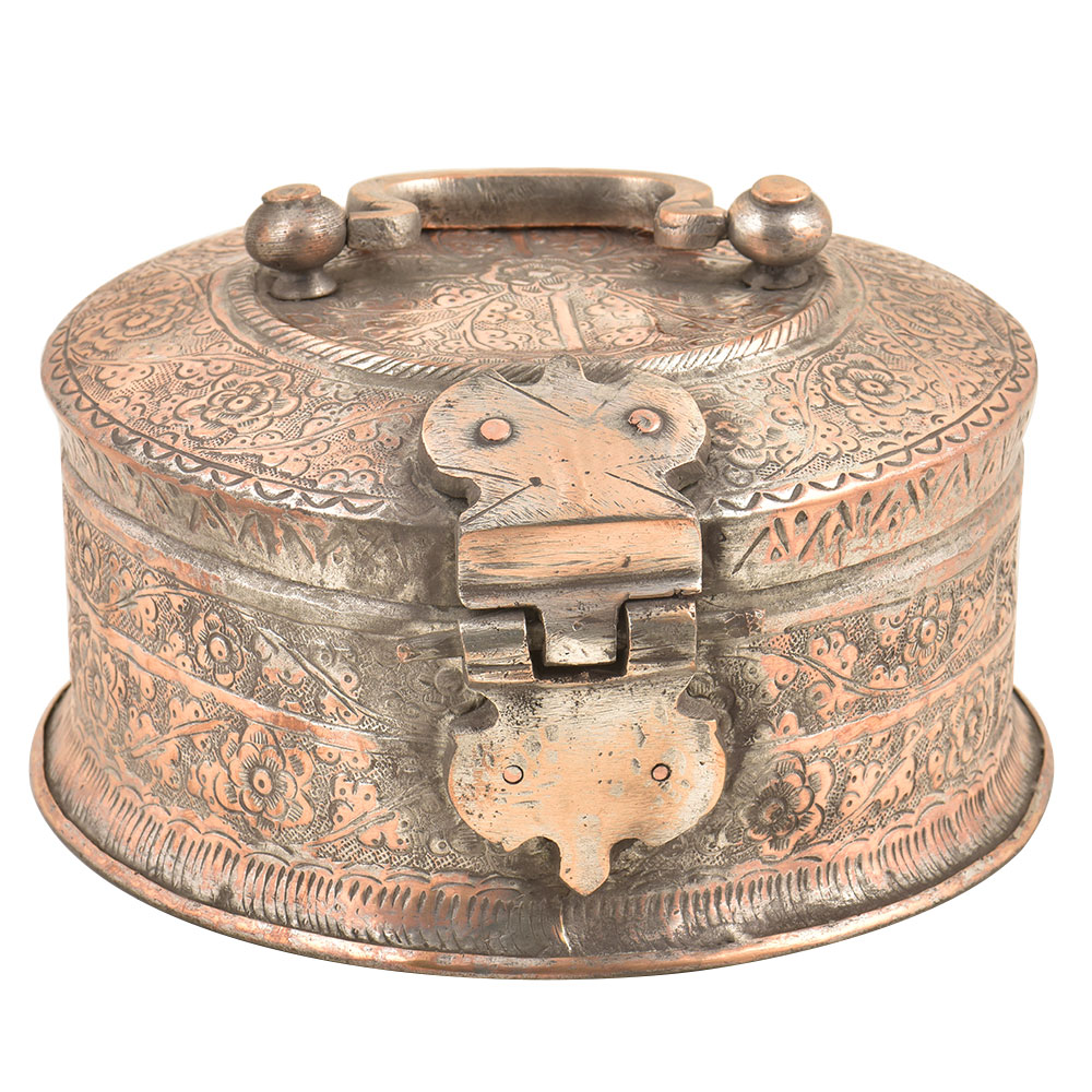 Rare Islamic Style Embossed Copper Betel Nut Pandan Box With Lock Handle