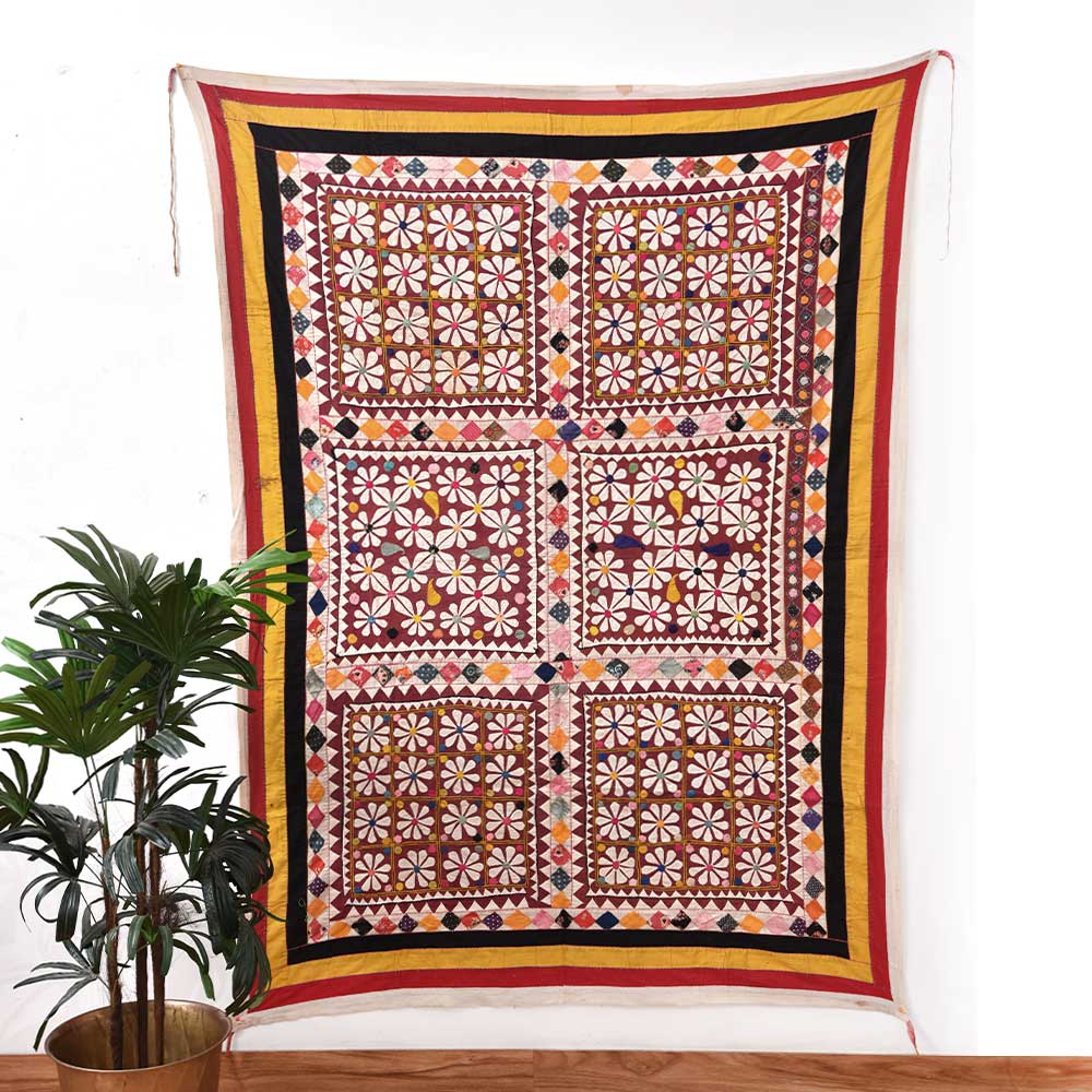 This vintage embroidered Wall Hanging is a magnificent piece of textile art that will bring colour, texture, and personality to any home. Layering several fabrics on top of one other and sewing them together to create a unique design is how this wall décor is made. A tiny piece of cloth is stitched onto a more significant piece of fabric to form a pattern or picture in this design. Creating an embroidered or appliqué work Wall Hanging entails multiple procedures. The design is then drawn onto the bigger piece of cloth that would be the backdrop. The smaller cloth pieces are cut out in the required shape and size. These pieces are then pinned into position on the backdrop cloth. The smaller pieces' edges are turned under and sewn onto the background cloth with a needle and thread. Lastly, backing fabric and a hanging mechanism complete the item. Wall Hangings of this type can be manufactured in many styles and designs. Some wall hangings are decorated with complicated patterns and motifs, while others are decorated with primary forms and bright colours. Traditional techniques commonly use floral themes, geometric forms, and natural sceneries. Abstract forms, vibrant colours, and current themes are examples of modern designs. One advantage of this embroidered fabric Wall Hangings is that they may be tailored to specific likes and trends. They may be produced in any size, shape, or colour and tailored to fit any room's decor. These may be mounted on any wall in the house, including those in the living room, bedroom, and bathroom. They may also be employed as a focal point or as a compliment to other décor components in a space. An embroidered work Wall Hanging, whether utilized as a central point or as a compliment to other décor components, is guaranteed to offer a touch of elegance and beauty to any room.