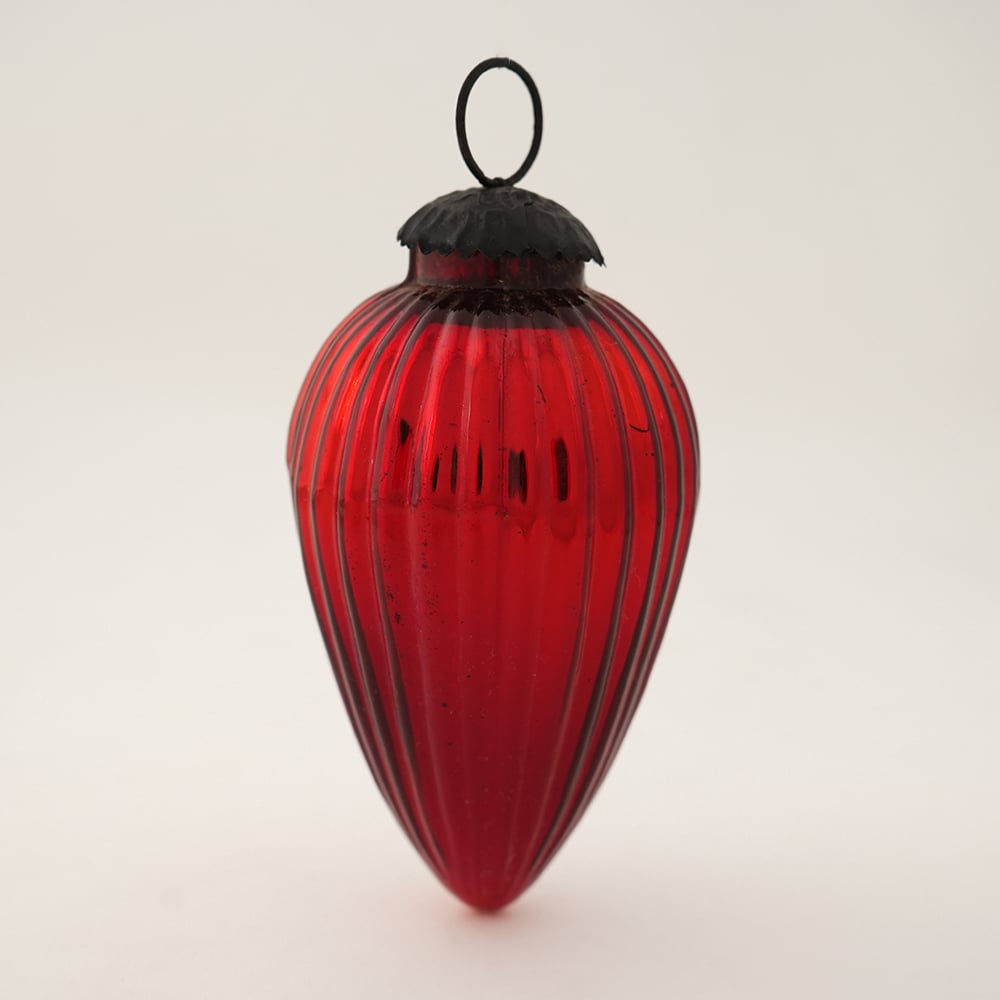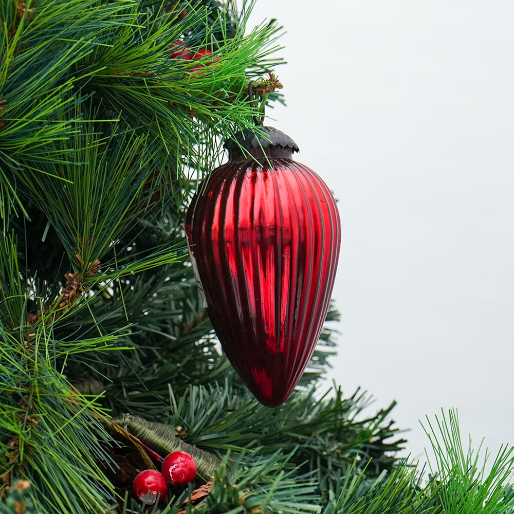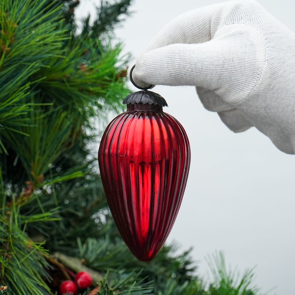 Red Almond Shape Christmas Glass Hanging. Crafted from high-quality glass with a smooth glossy finish, this decorative bauble adds a classic and festive touch to Christmas trees, wreaths, and holiday displays.
