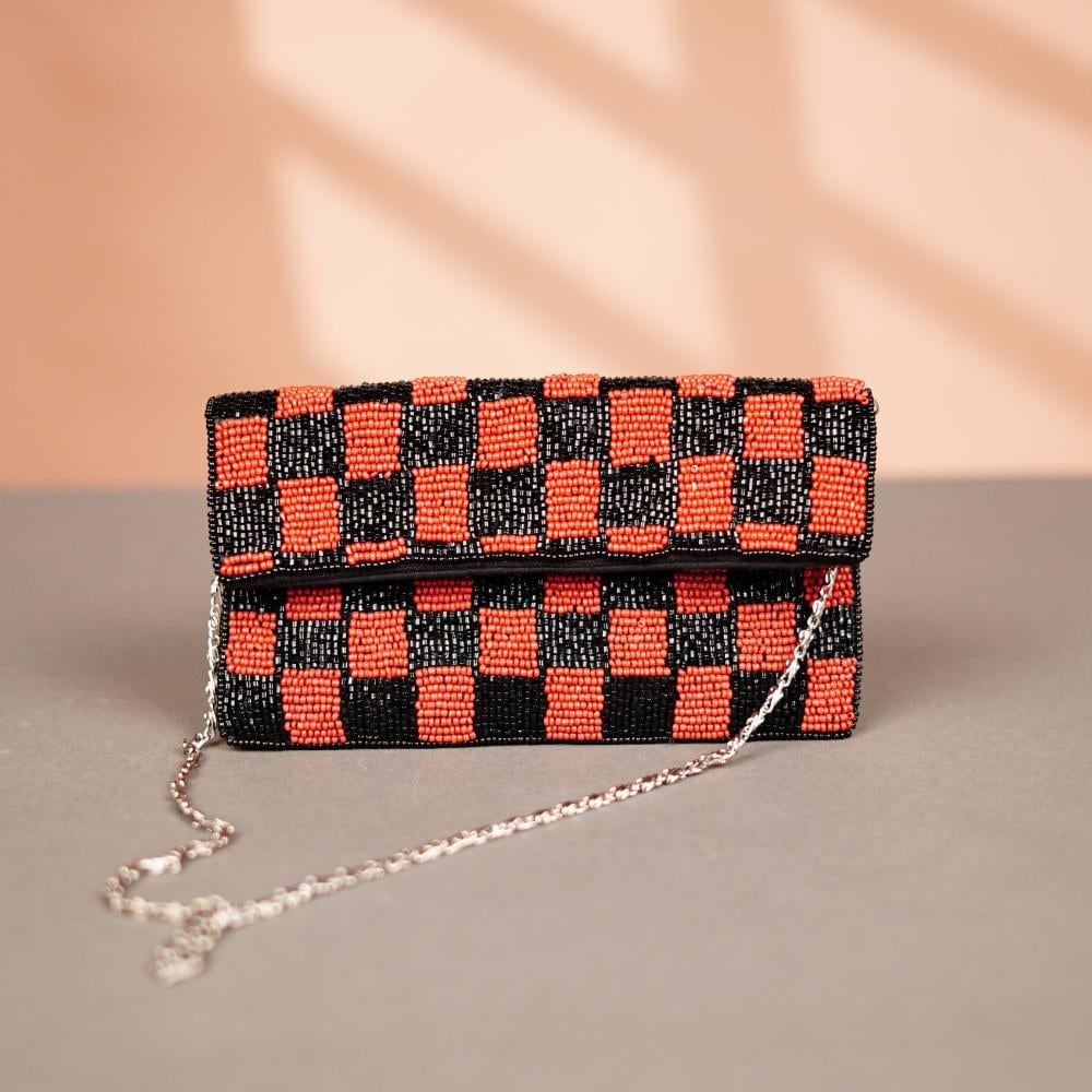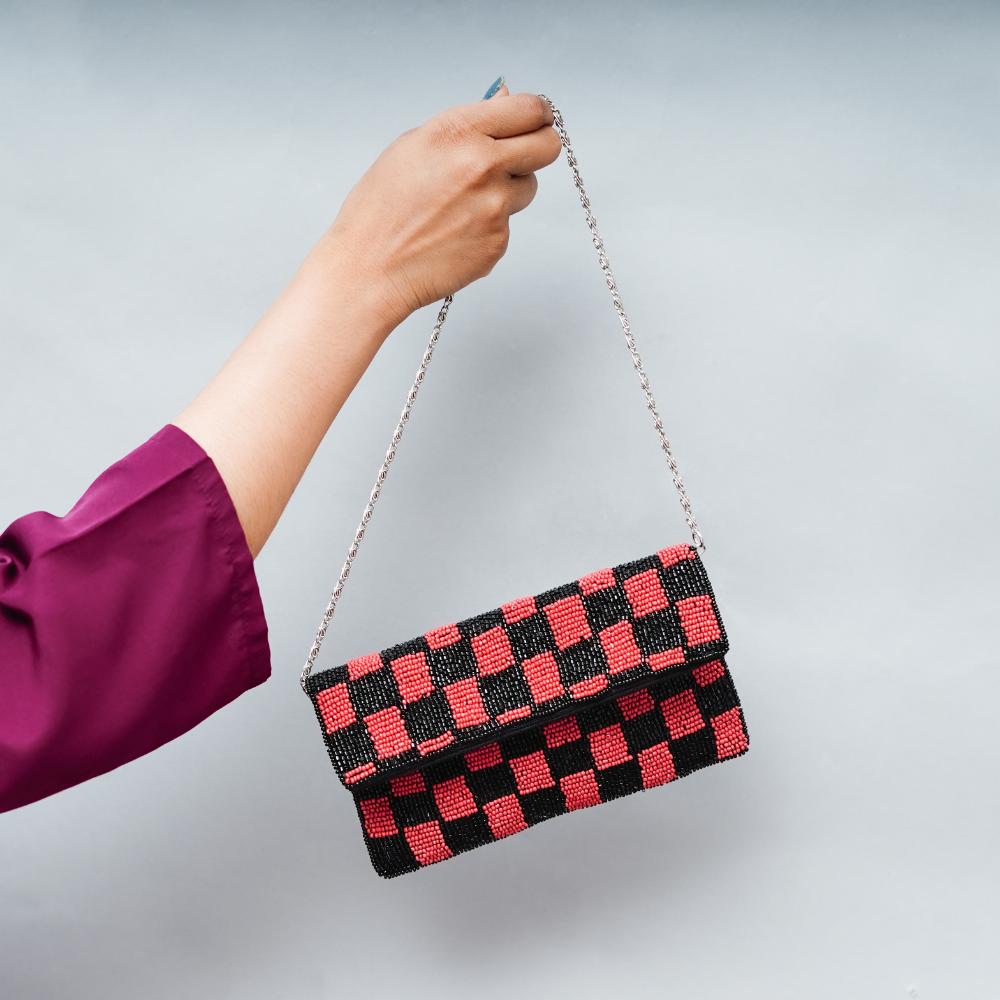 Crafted with precision and artistry, this cotton and beaded handbag is a visual delight. The bold checkerboard pattern in fiery red and deep black brings an edgy vibrancy to this elegant piece. Each bead is hand-stitched onto a durable cotton base, forming a richly textured surface that catches the light beautifully. Its sleek rectangular shape, complemented by a silver chain strap, gives it a refined look that transitions effortlessly from day to night.