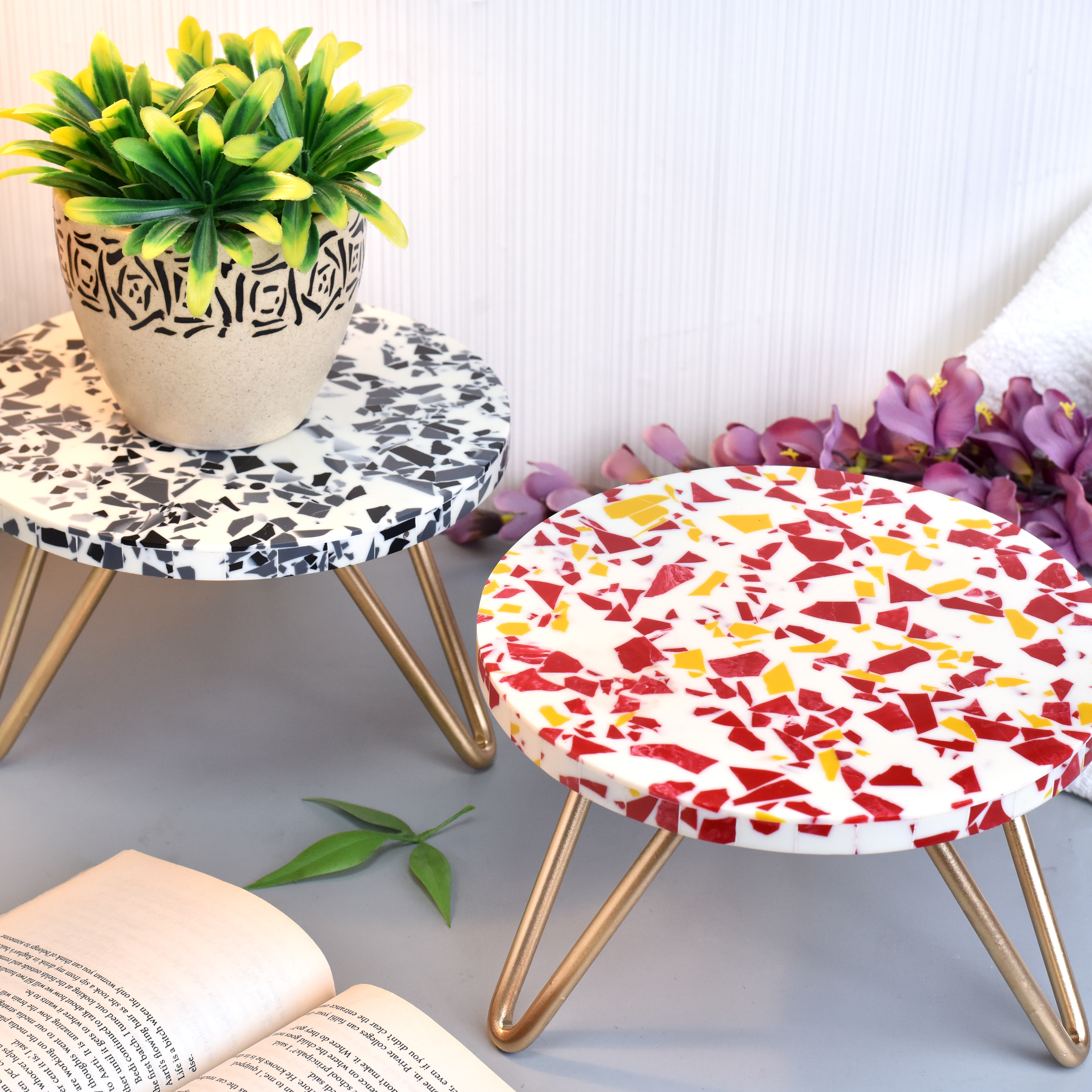 Red and Black Terrazzo Wood and Resin Cake Stand for Dessert, Fruit and Planter