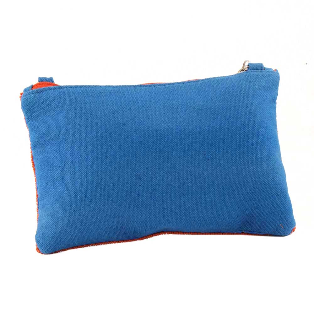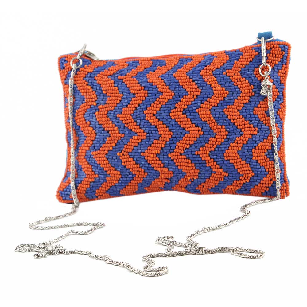 This red and blue glass and cotton beaded ziptop clutch bag is a perfect choice if you're looking for an ethnic Designer clutch with a voguish, modernistic, and sleek style that allows you to carry only the essentials.