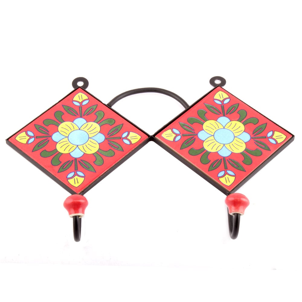 Red And Yellow Floral Tiles Hooks. When Put on Wall or Cabinet it is an Art in itself. The Metal Part of this Hook is Black Powder Coated.