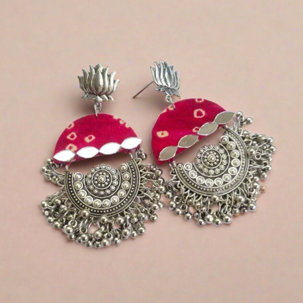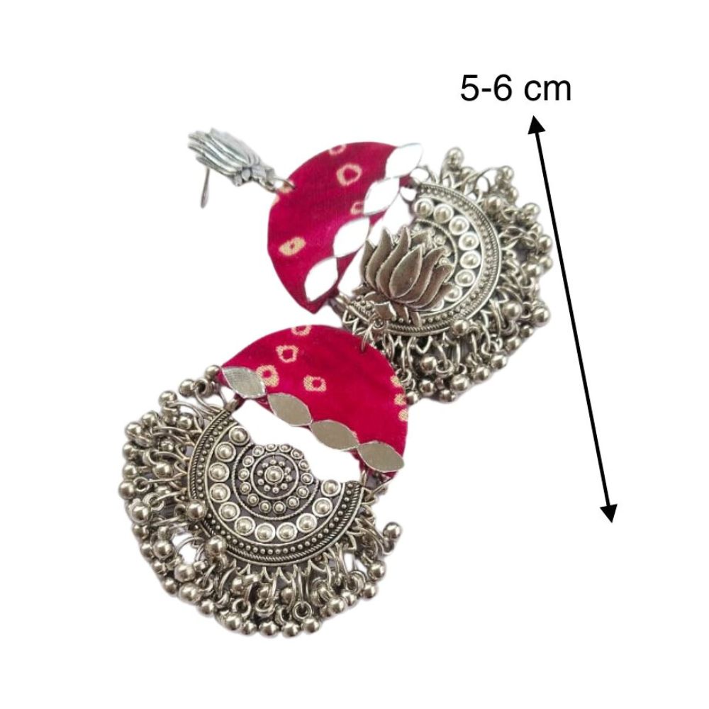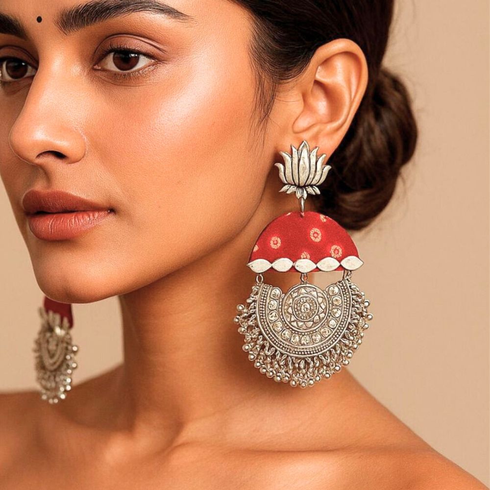 These Red Bandhani Print Heavy Oxidized Jhumka Earrings bring the charm of traditional Indian textiles into a beautifully handcrafted jewelry piece. Featuring classic red-and-white Bandhani fabric paired with intricately oxidized silver-tone jhumka detailing, this pair blends culture, color, and craftsmanship effortlessly. Lightweight yet visually bold, they are perfect for women who love expressive ethnic jewelry rooted in tradition.