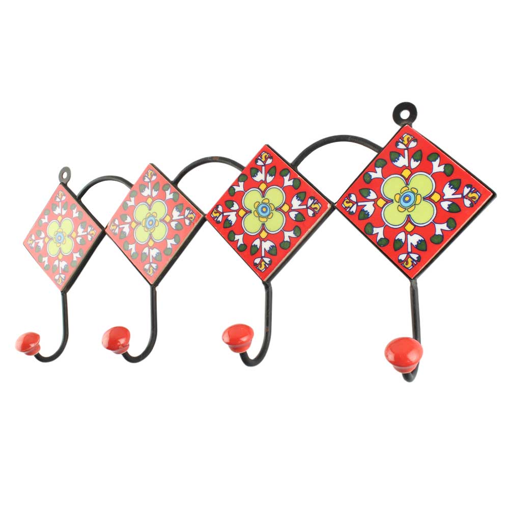 Red Big Ceramic Floral Tile Hook. When Put on Wall or Cabinet It is An Art in Itself. The Metal Part of this Hook is Black Powder Coated.