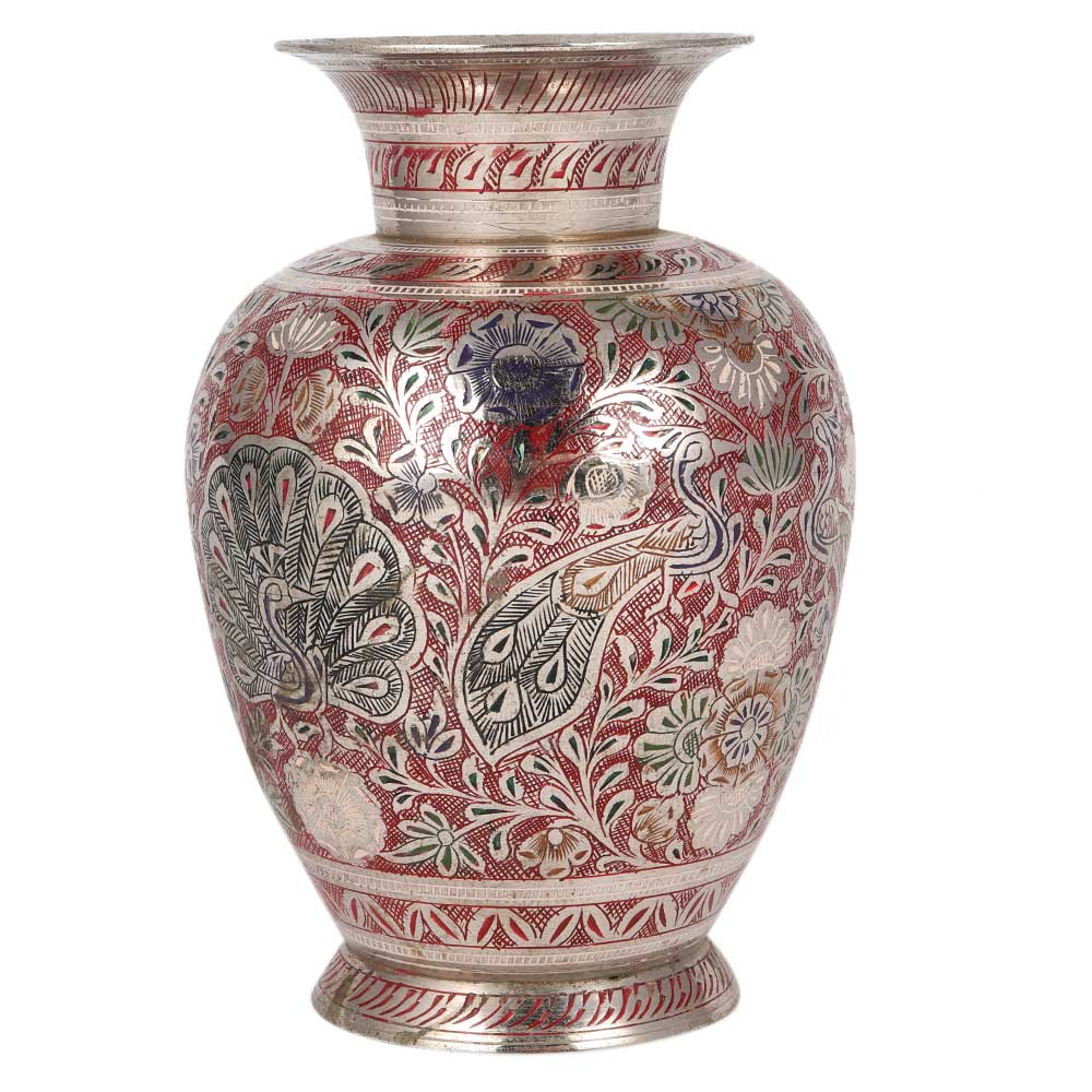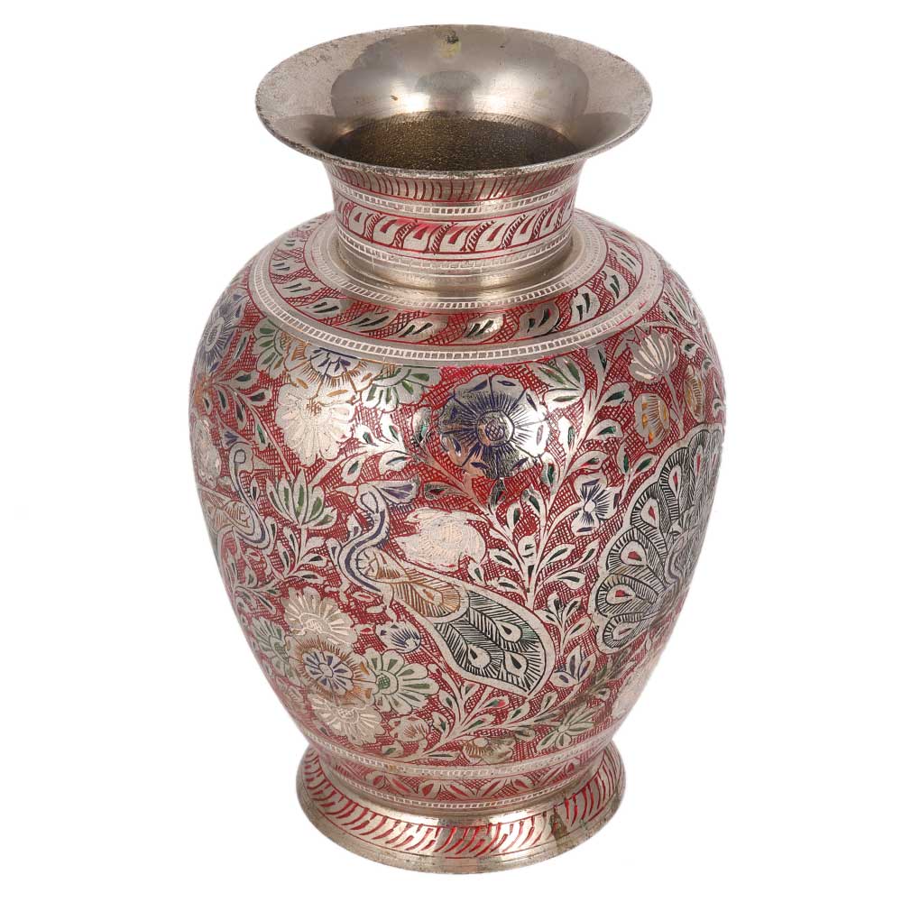 Red meenakari brass flower vase work can enrich your home's interior and give it a more beautiful appearance. Genuine and a good buy for any occasion. It will offer your residence, guesthouse, office or cafe a traditional look.